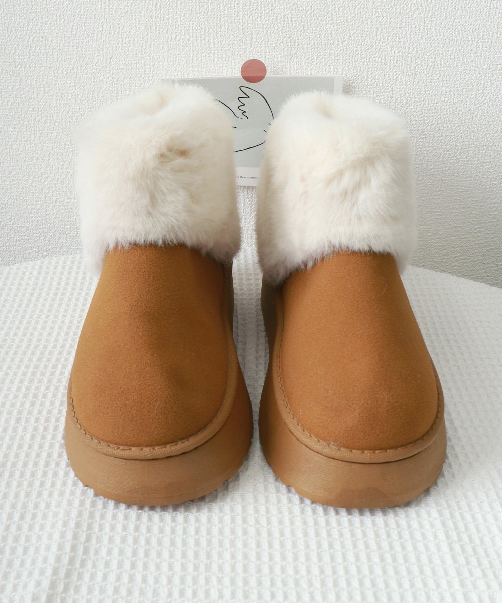 履き口にボリュームたっぷりのフェイクファーをあしらったデザインのムートンブーツ。