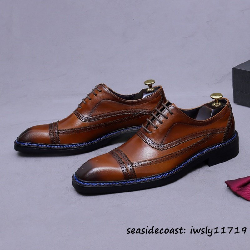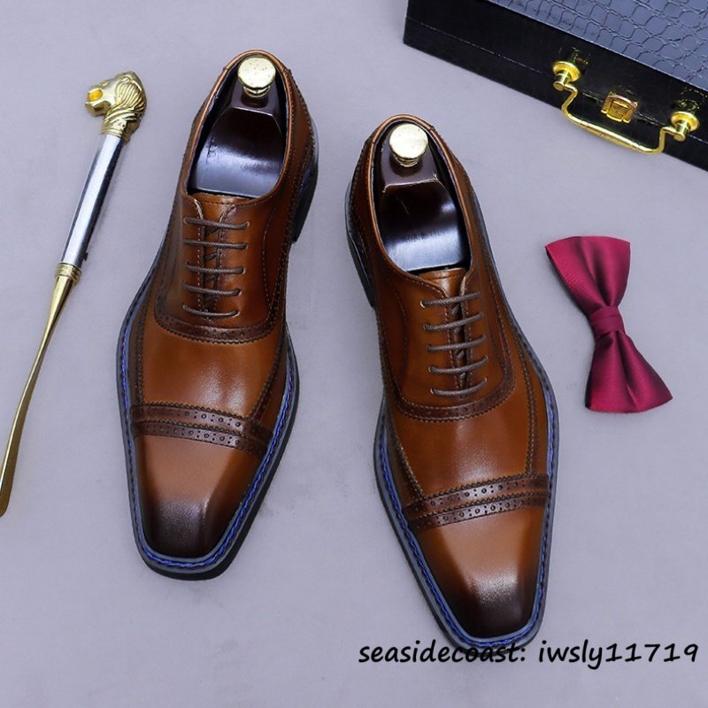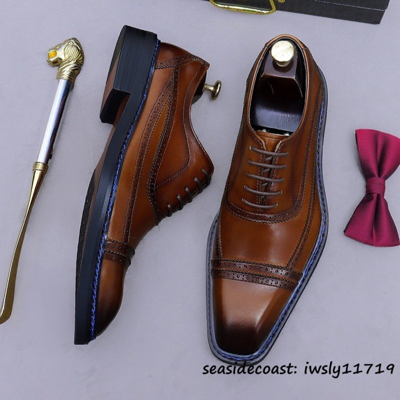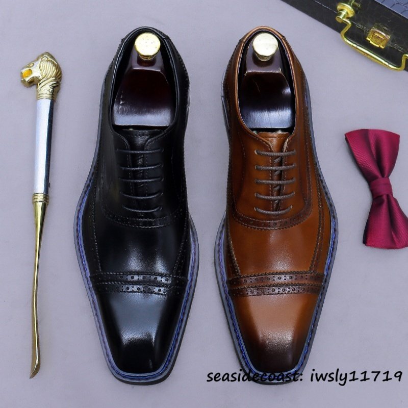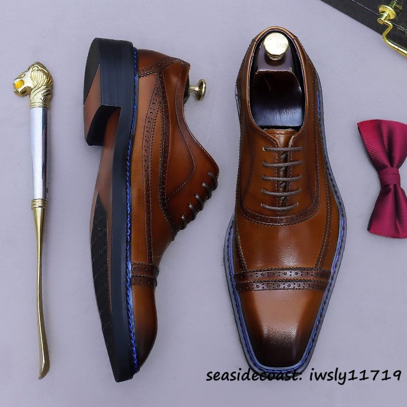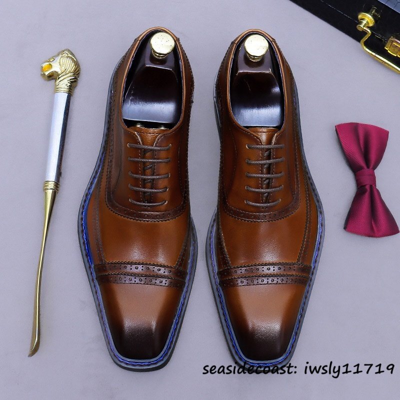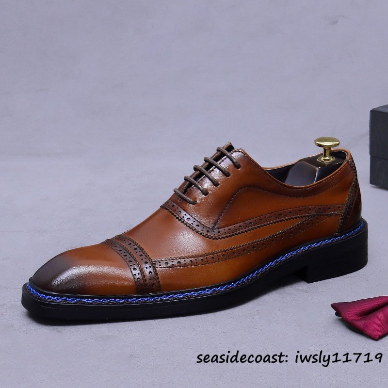 超希少*定価9万 ビジネスシューズ メンズ 本革 最高級 職人手作り 彫り レザーシューズ 革靴 牛革 紳士靴 フォーマル 新品 ブラウン 25.0cm