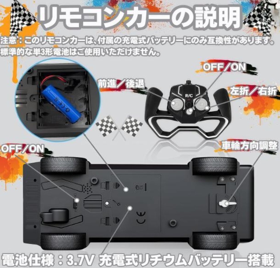 (注:本ラジコンカーは、付属の充電池とのみ互換性があります。標準的な単3形電池(AA 電池)は本製品と互換しないため、誤って使用しないでください。リモコンには単3形電池(AA電池)2本が必要ですが、包装内には含まれていませんのでご準備をよろしくお願いいたします。)