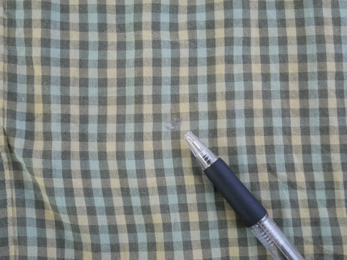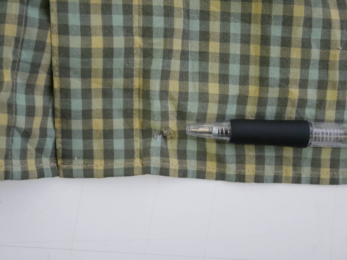 左すそ付近にほつれによる小穴(画像4枚目参照)、小さな汚れの付着(画像5枚目参照)、背面にうっすらとシミがあります。(画像6.7枚目参照)