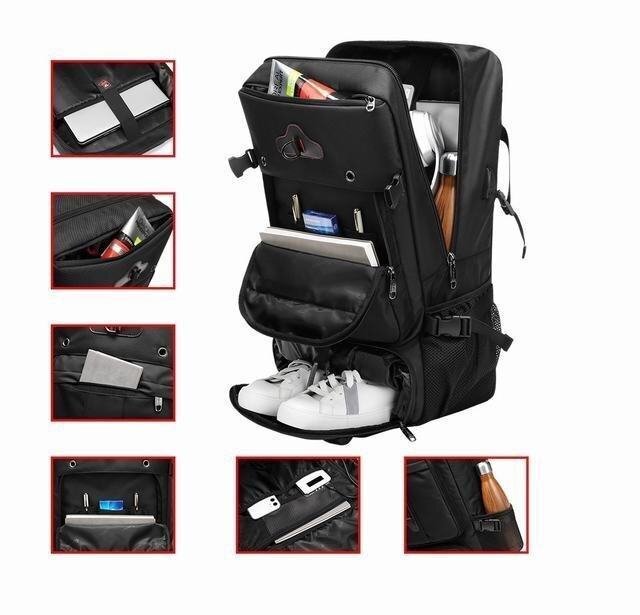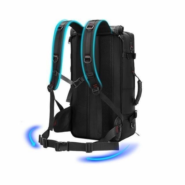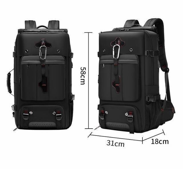 スクエア型収納力抜群、サングラス、テント、モイスチャーパッド、寝袋、トレッキングポール、衣類、登山靴、傘、iPad、ラップトップ、カップ、シャンプー、歯ブラシ、洗顔料、救急箱、ロープ、食べ物など、日用品をすべて収納できます。3~5かかん日間のしゅっちょー出張りょこー旅行にごりよー利用いただけます。