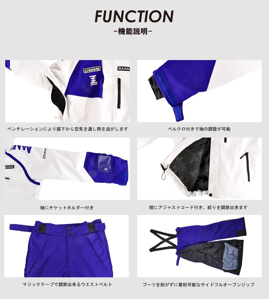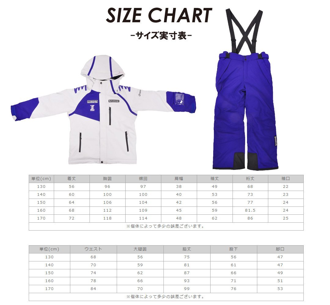 | 詳細 | 北海道に住む私たちが、冬に着たいスノーウェアとは、を考えて作り上げた 当社オリジナルブランド「BANNNE」 BANNNE(バンネ)ブランドより、上位モデルのBANNNE CHROMEシリーズ サイドオープンパンツ搭載のジュニアスキースーツです。 こちらのスキーウェアは50年以上の実績を持つオンヨネ社の協力により誕生した高機能スキーウェアです。 耐水圧:15000mm 透湿性:25000g/m2/24hrs の高機能ウェアで、低価格を実現。 高い透湿性は、汗による蒸れを軽減し、またジャケット脇下部分にベンチレーションを 配した快適なウェアです。 パンツはサイドフルオープンジップによりブーツを脱がずに着脱可能です。 スキー競技や、ジャンプなどの競技をされている方には待機時での着用などサイドオープンパンツは 探すとなかなかないウェアですので、最高のアイテムです! 防水・撥水素材を採用し、高い撥水性と耐水圧で風や雨・雪の侵入を防ぎます。 様々な機能を備えたスキースーツ、この機能でこの価格は当店オリジナルブランドだからこそ できた渾身のウェアです! 【サイズ】 ジャケット: 単位(cm)/着丈/胸囲/裾回/肩幅/袖丈/裄丈/袖口 130/56/96/97/38/49/68/22 140/60/100/100/40/53/73/23 150/64/106/104/42/56/77/24 160/68/112/109/45/59/81.5/24 170/72/118/114/48/62/86/25 パンツ: 単位(cm)/ウエスト/大腿囲/脇丈/股下/脚口 130/68/56/75/56/47 140/70/59/81/61/47 150/74/62/87/66/49 160/78/66/93/71/51 170/84/70/99/76/53 ※個体によって多少の誤差ございます。 【カラー】 002735_ICEGRAY×RACEB 【素材】 ・表地:ポリエステル100%(ポリウレタンラミネート加工) ・裏地:ポリエステル100% ・中わた:ポリエステル100% 【耐水性】 耐水圧:15000mm 透湿性:25000g/m2/24hrs 【機能】 ジャケット: ・フード取外し可能 ・襟裏トリコット ・左袖パスケース(収納可能) ・裾ドローコードで調整可能 ・袖口はマジックテープにて調節可能 ・フロントポケット2か所 ・左胸ポケット1か所 ・ベンチレーションにより脇下から空気を通し熱を逃がします パンツ: ・サスペンダー(取り外し可能) ・ウエストアジャスター ・前ポケット2箇所 ・雪の浸入を防ぐ足口スパッツ ・スキー板等との接触で傷みやすい内裾にエッジガード付 ・ブーツを脱がずに着脱可能なサイドフルオープンジップ |