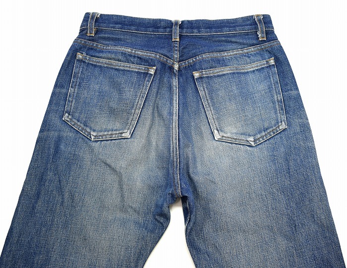 ・素材: コットン100% ・カラー: インディゴブルー ・サイズ: 29 実寸(平置きにして)ウエスト 約70cm・股上 約28cm・股下 約72cm・腿幅 約28.5cm・裾幅 約19cm(多少の誤差はお許しください) 無駄を削ぎ落としたミニマルなデザインで、洗練されたシルエットが特徴のセルヴィッチデニムです。 シンプルな中でもフロントボタン、リベットにのみ刻まれているA.P.C.のロゴにもデザイナーの拘りを感じます。 こちらは A.P.C.の美しい色落ちが印象的なデニムパンツです。 タグに「STANDARD」と記載のあるモデルで、定番のストレートシルエット。 無駄のない美しいラインが特徴です。 現在は生産されていない「EAST by WEST(イーストバイウエスト)」時代の日本製の赤耳(セルヴィッチ)モデル。 現行モデルにはないしっかりとした生地感とリアルな経年変化の深みが魅力。 A.P.C.ファンの間でも根強い人気を誇る希少なデニムです。 加工ではない、実際に穿き込まれたて生まれた自然な色落ち。 ヒゲ、ハチノス、腿から裾にかけてのフェード感などリアルヴィンテージのような立体的な表情が出ています。 古着市場でも「ナチュラルフェードのA.P.C.」は非常に評価が高く、これだけ美しい落ち方をしている個体はなかなかありません。 状態も良好で目立つ大きな傷み、汚れなし、リペア跡なし。 まだまだ長く愛用できる1本です。 「アーペーセー」らしいミニマルなデザインと日本製ならではの上質な縫製。 スタンダードな形なのでどんなスタイルにも合わせやすく、シャツやジャケット、スウェットにも相性抜群です。 この (株)イーストバイウエスト期の日本製セルヴィッチデニムは、現行では手に入らないプレミアムなアイテムです。 MADE IN JAPAN かなりお値打ちだと思います。この機会にぜひ! 他にもいろいろ出品しています。 管理番号: 132510Y-090592★ |