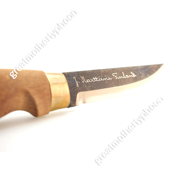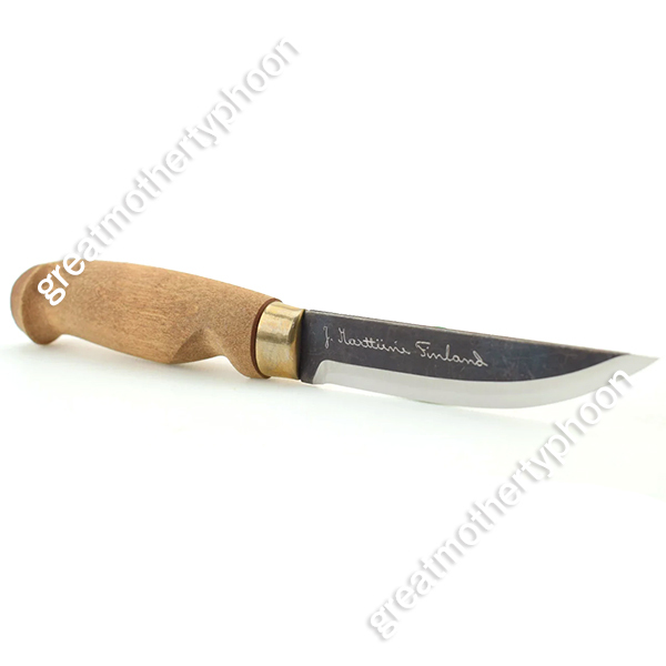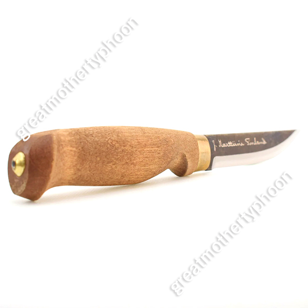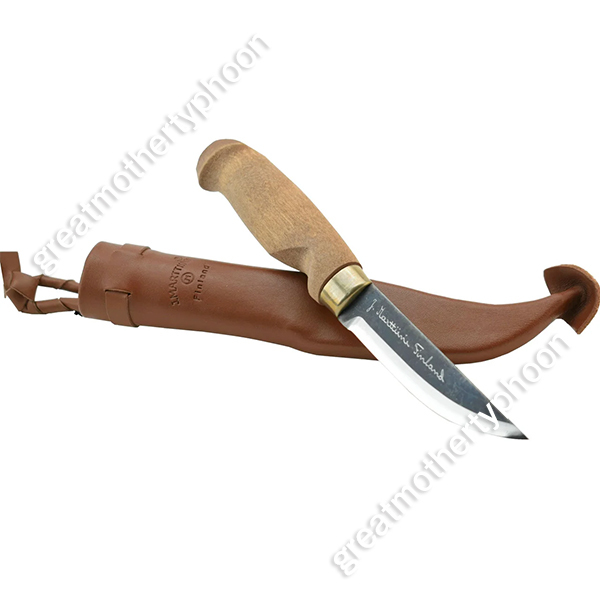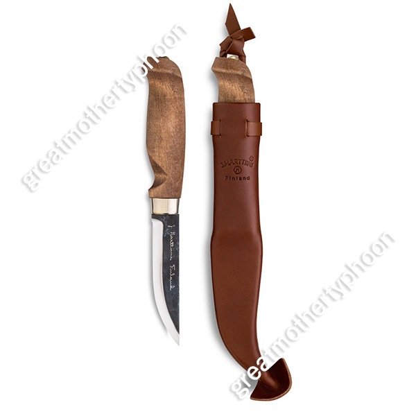 マルティーニのシースナイフ「ランバージャック カーボン」です。製品番号127012です。ブレードはカーボン(炭素銅、HRC55-57)です。刃長は約10cm、刃厚は最も厚い個所で約3.1mmあります。全長は約22cm、グリップは白樺、シースはレザー製です。