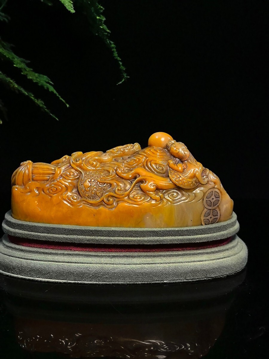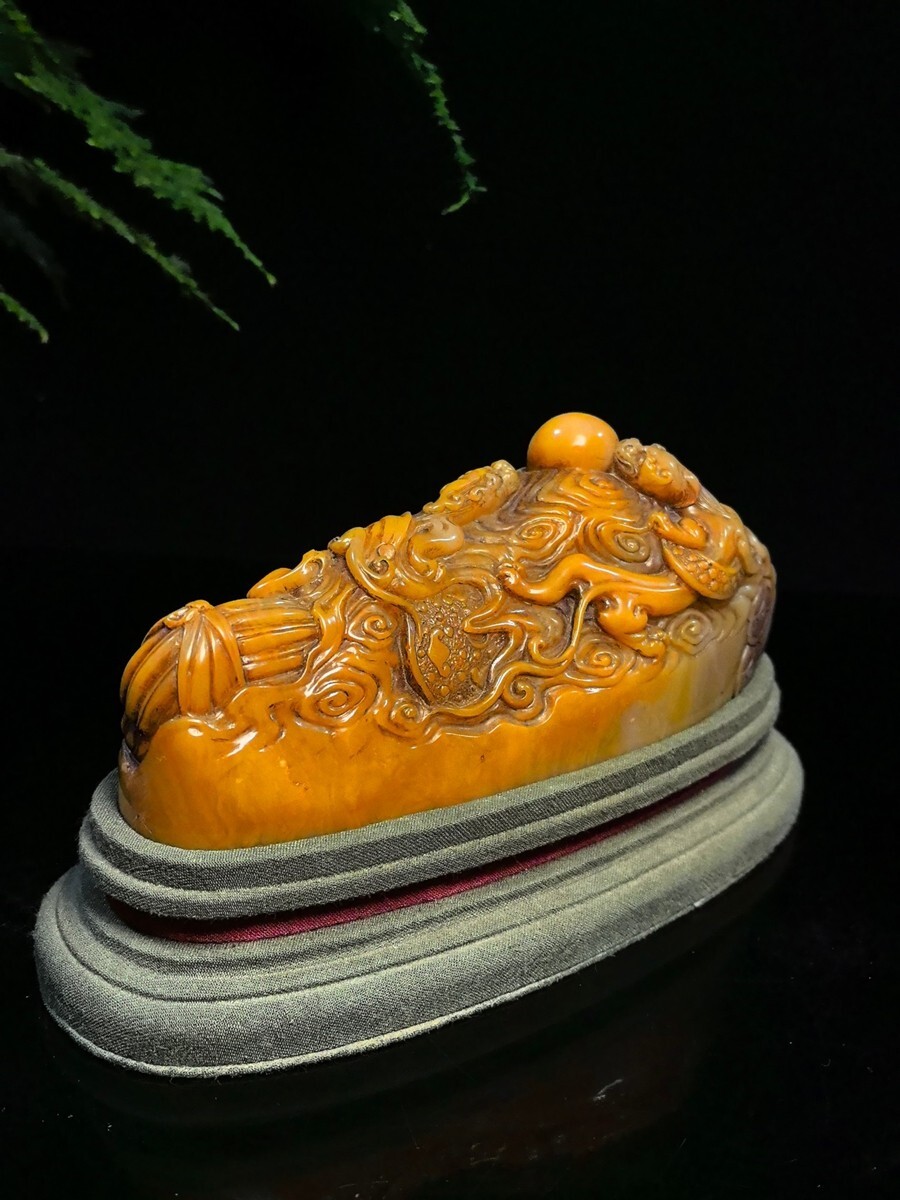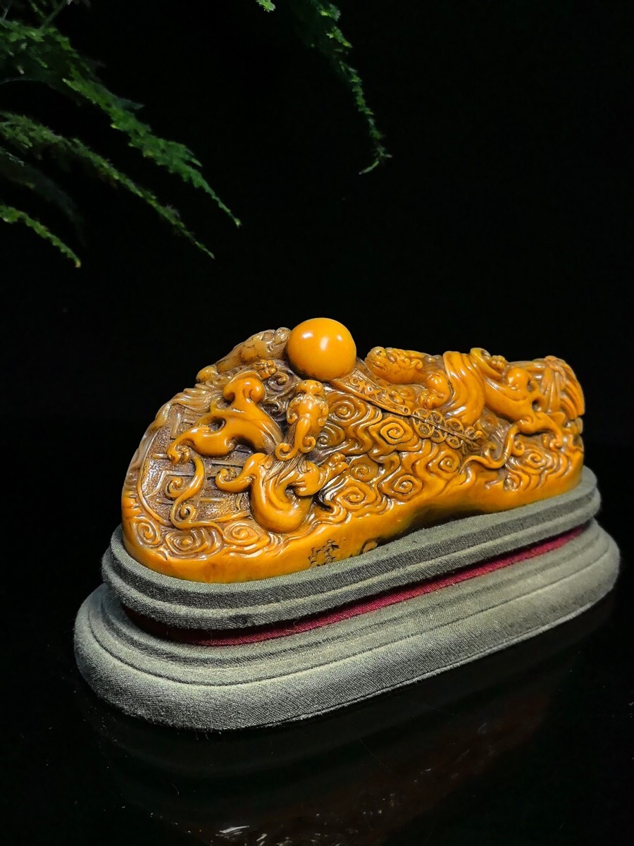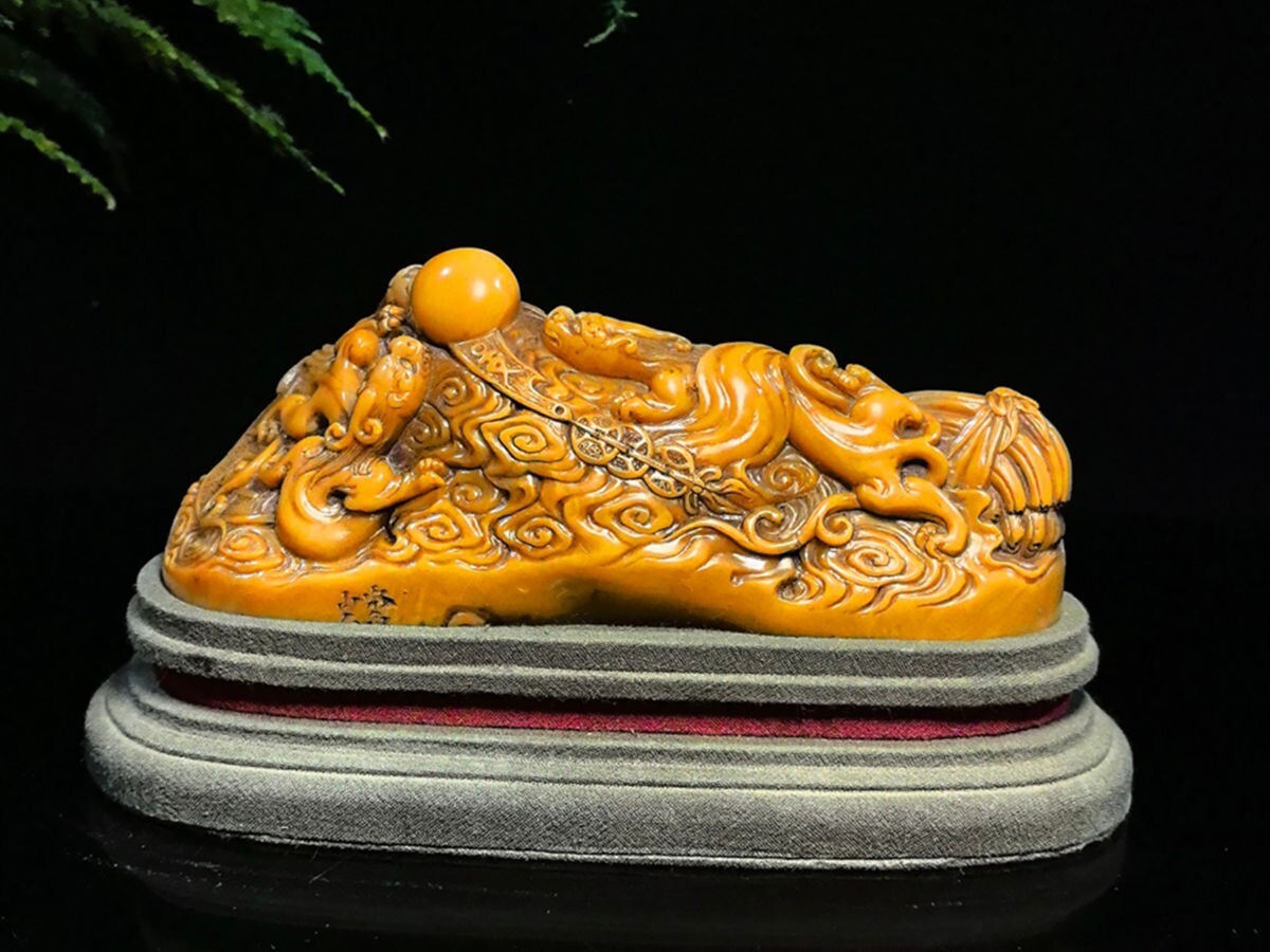 「清 完白山人 老寿山石 田黄石彫り 祥龍戲珠 印章擺件」極細工 擺件 古賞物 中国古美術 旧蔵出