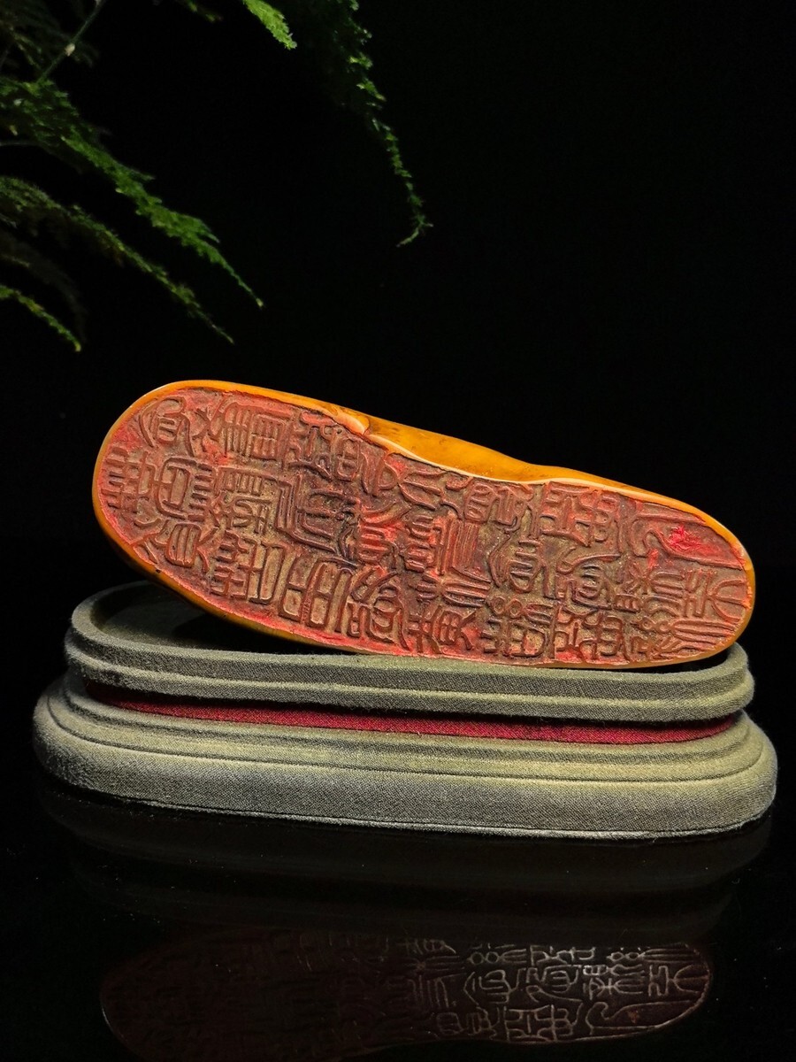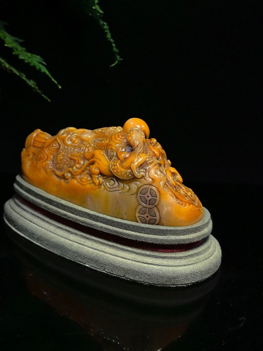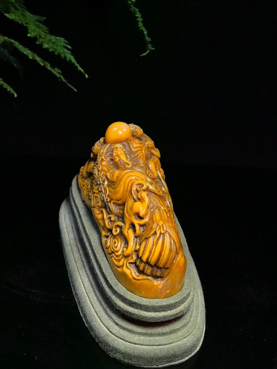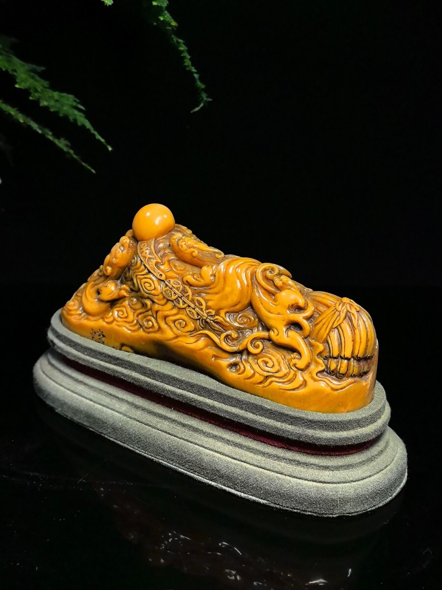 「清 完白山人 老寿山石 田黄石彫り 祥龍戲珠 印章擺件」極細工 擺件 古賞物 中国古美術 旧蔵出