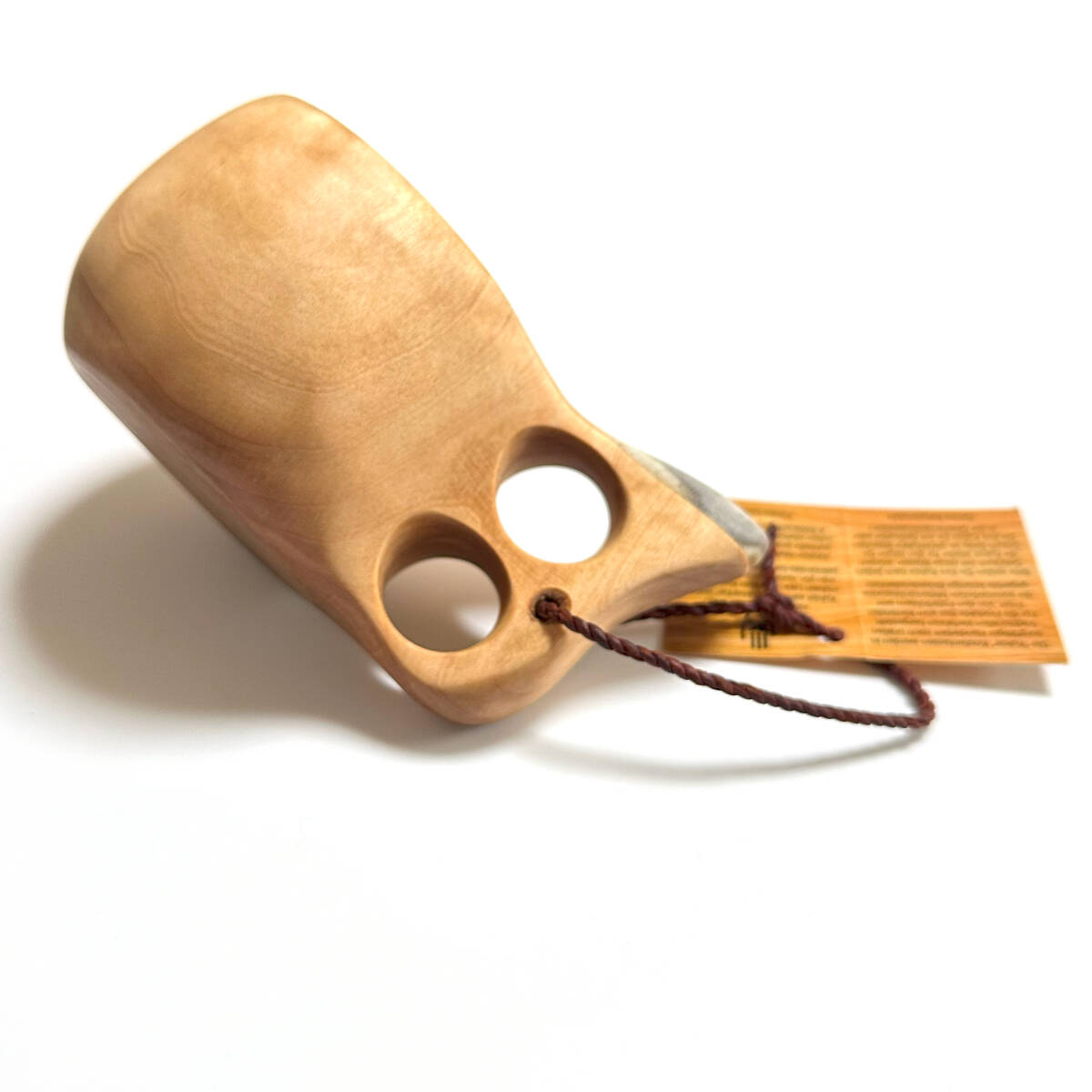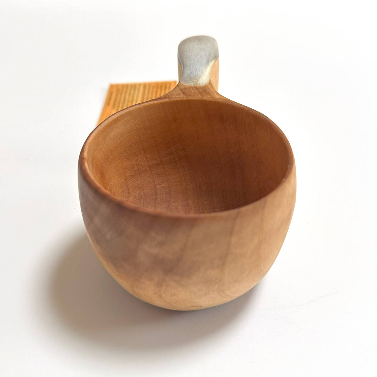 コイヴマーのククサ現品です。白樺の丸太から切り出されて作られたククサです。持ち手の上部にトナカイの骨が付いています。容量は180から190ml程度で、製品サイズは長手13.8×短手8.6×高さ6.6cm程度です。食洗器や食器用洗剤不使用でお願いします。