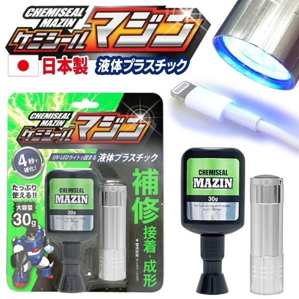 | 付属のUV-LEDを照射して固まる! 液体プラスチック「ケミシールマジン」! かんたん3ステップで約4秒で硬化! 1→塗布、2→照射、3→完成! 使い道はいろいろ! ■ プラスチック・金属・ガラスなどの補修、接着、成形 ■ 木材・レンガ・セラミックのひび割れや穴埋めなどの補修 ■ プラモデルや模型、フィギュアなどのパーツ補修、複製、成形 ■ コード・ケーブルなどの断線防止、補強、修理 ■ アクセサリーの成形、補修 など 日本製樹脂を採用。 高透明・低臭気・低刺激で使いやすい。 たっぷり使える、大容量30g! 硬化に必要なUVライトが付属! 乾電池をご用意いただけば、すぐに使用できます♪ |