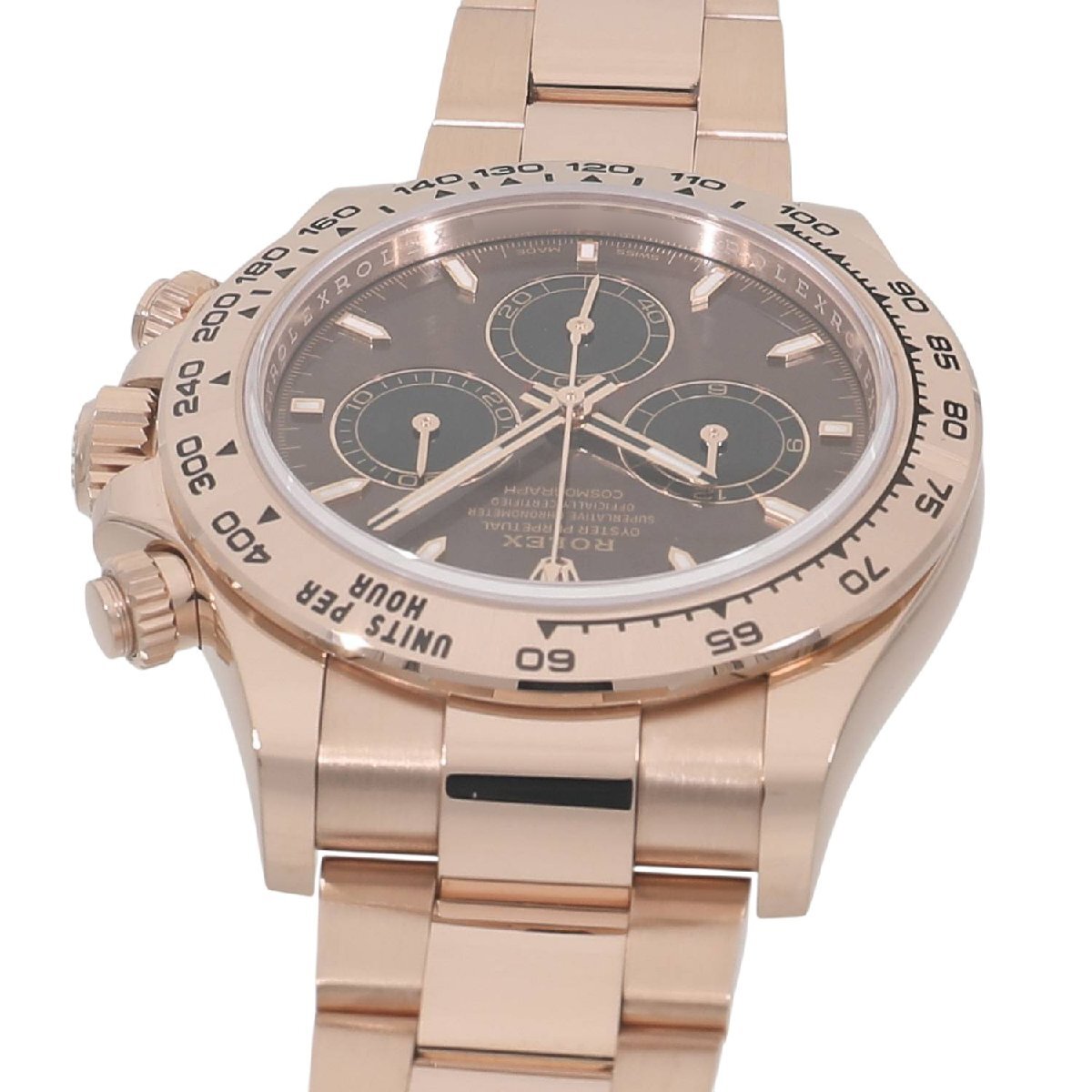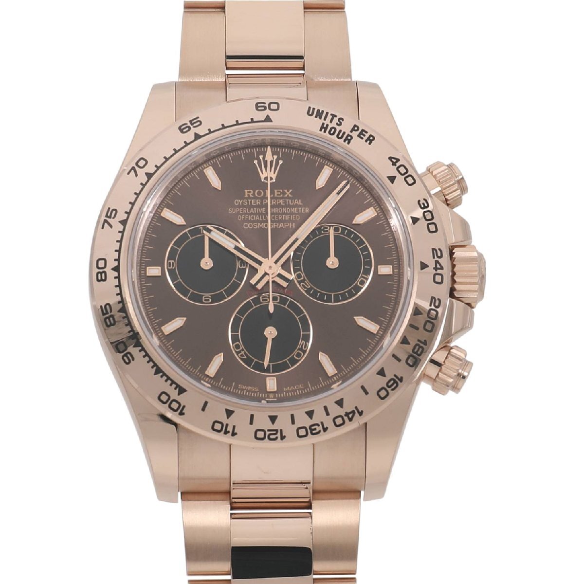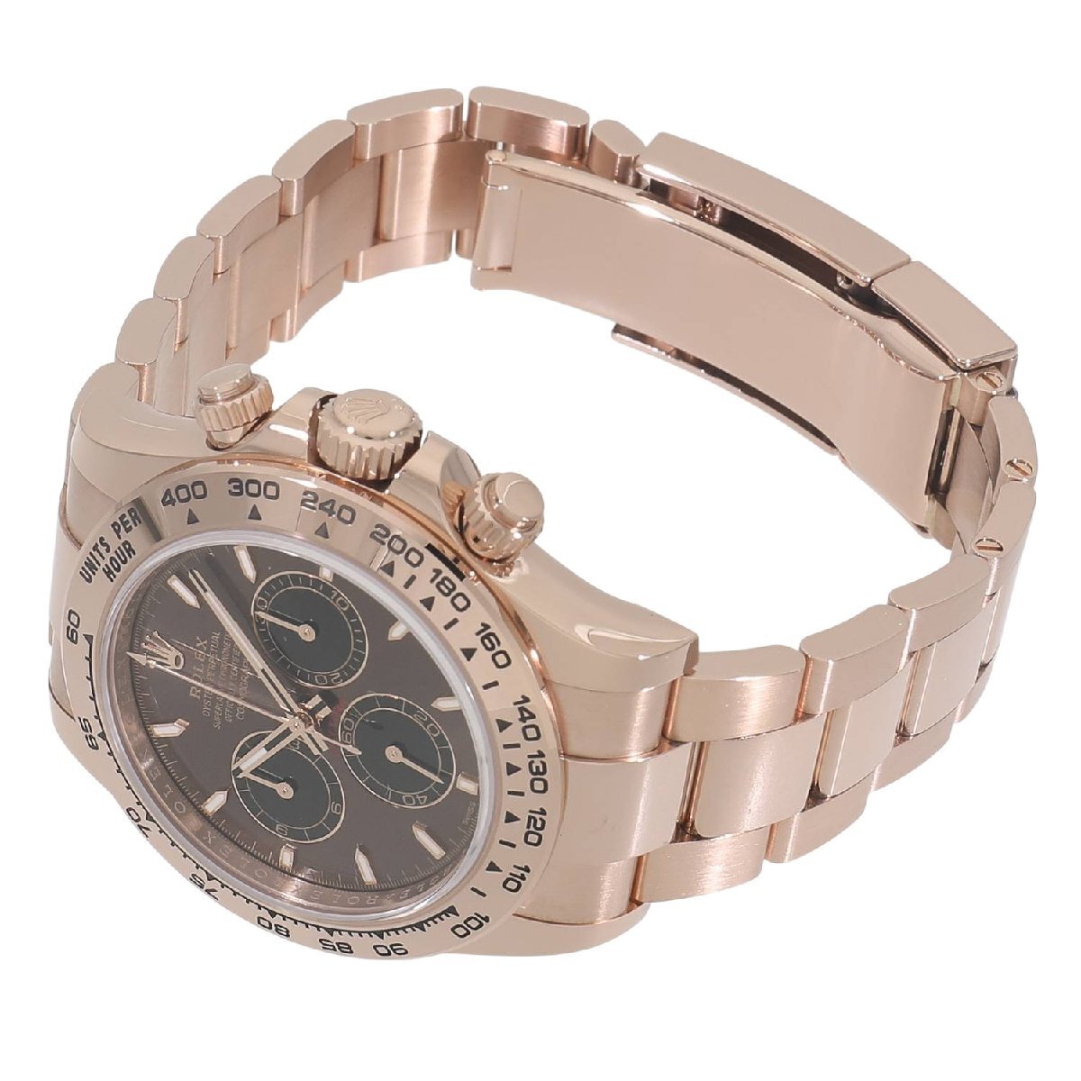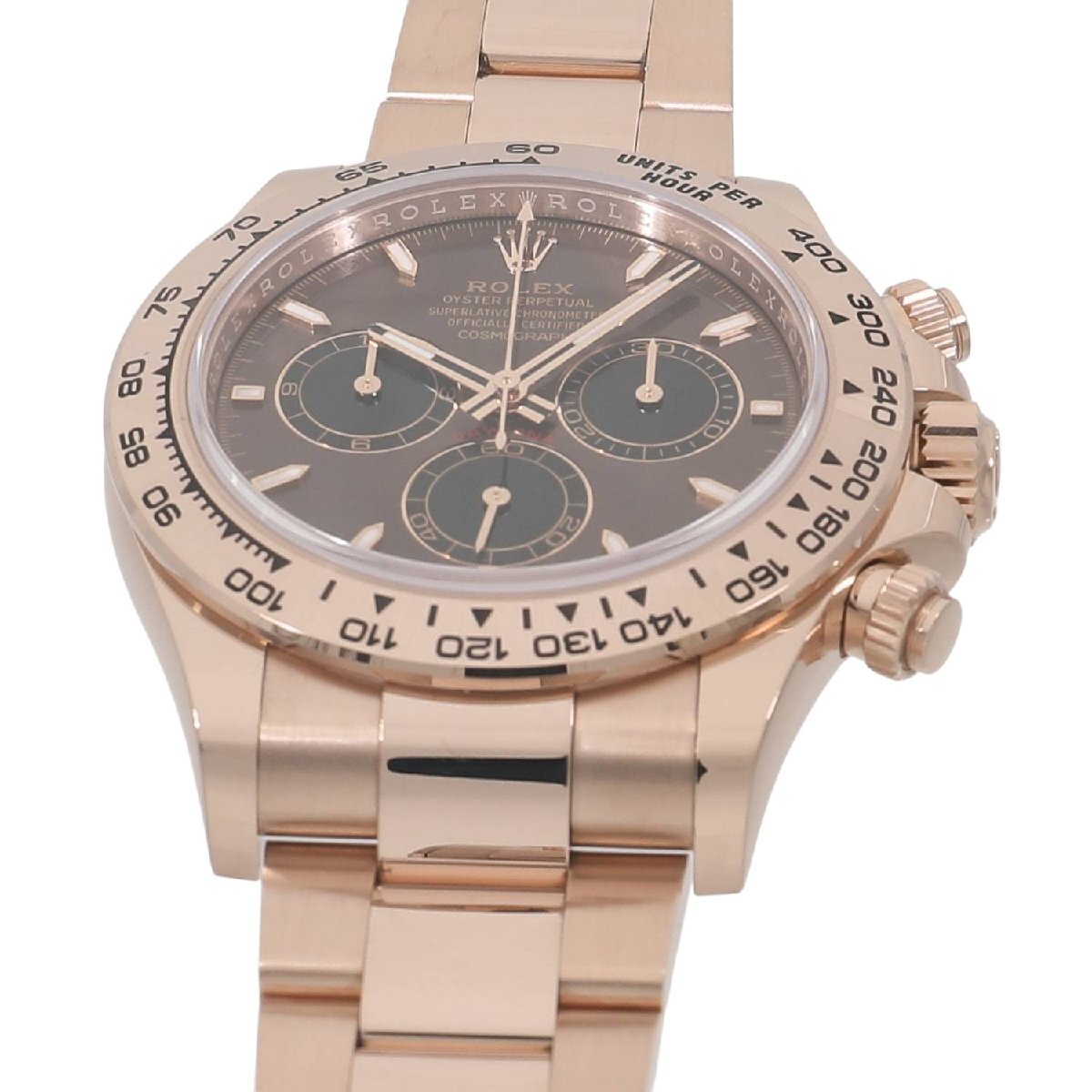 モデルについて | 2023年の新作 誕生から60周年を迎えたコスモグラフ デイトナ。新キャリバー4131に載せ替えられ、ケースやインデックスにも僅かに改良が加えられています。ラグジュアリーさを感じさせる重厚なローズゴールドのケースとブレスレット。文字盤はブライトブラックをベースにサンダストカラーのカウンターを組み合わせる事で、上品さを感じさせる印象に仕上がっています。6時のカウンター上にペイントされた赤いDAYTONAの文字がアクセントとなり、クールさも感じさせます。 |