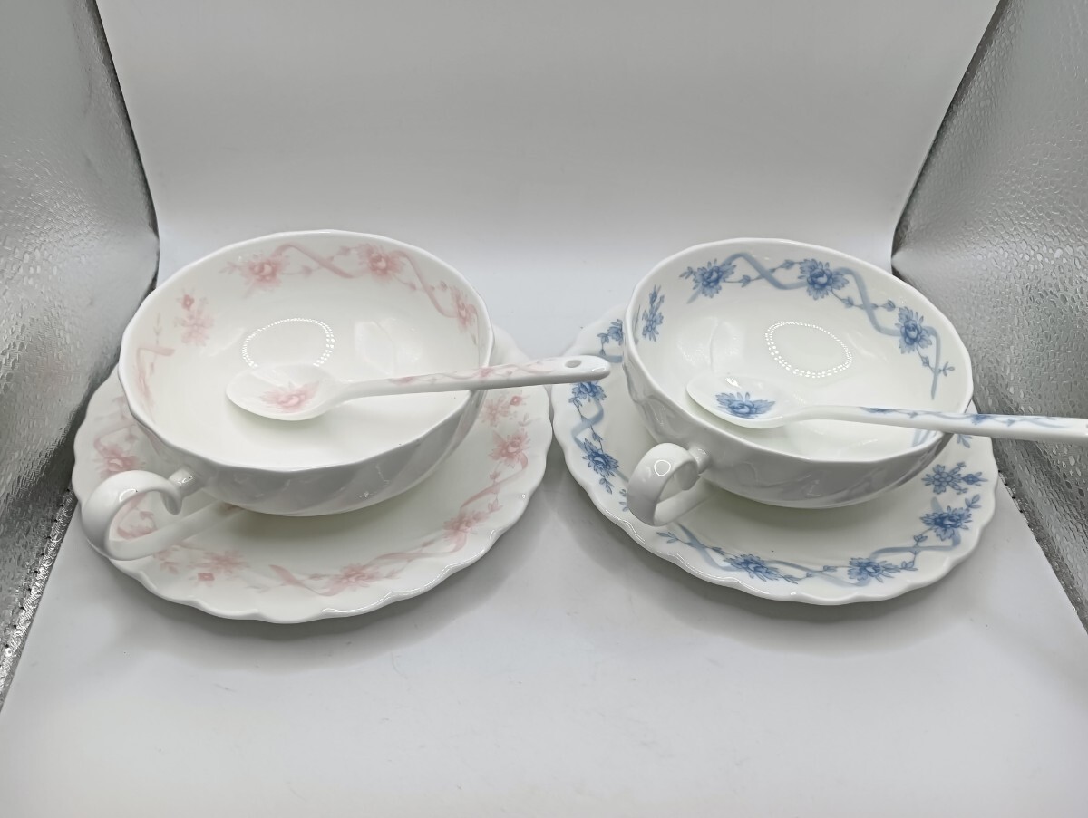 ・仕様の要点:ティーカップ&ソーサー&スプーンの3点×2客セット(ピンク・ブルー)