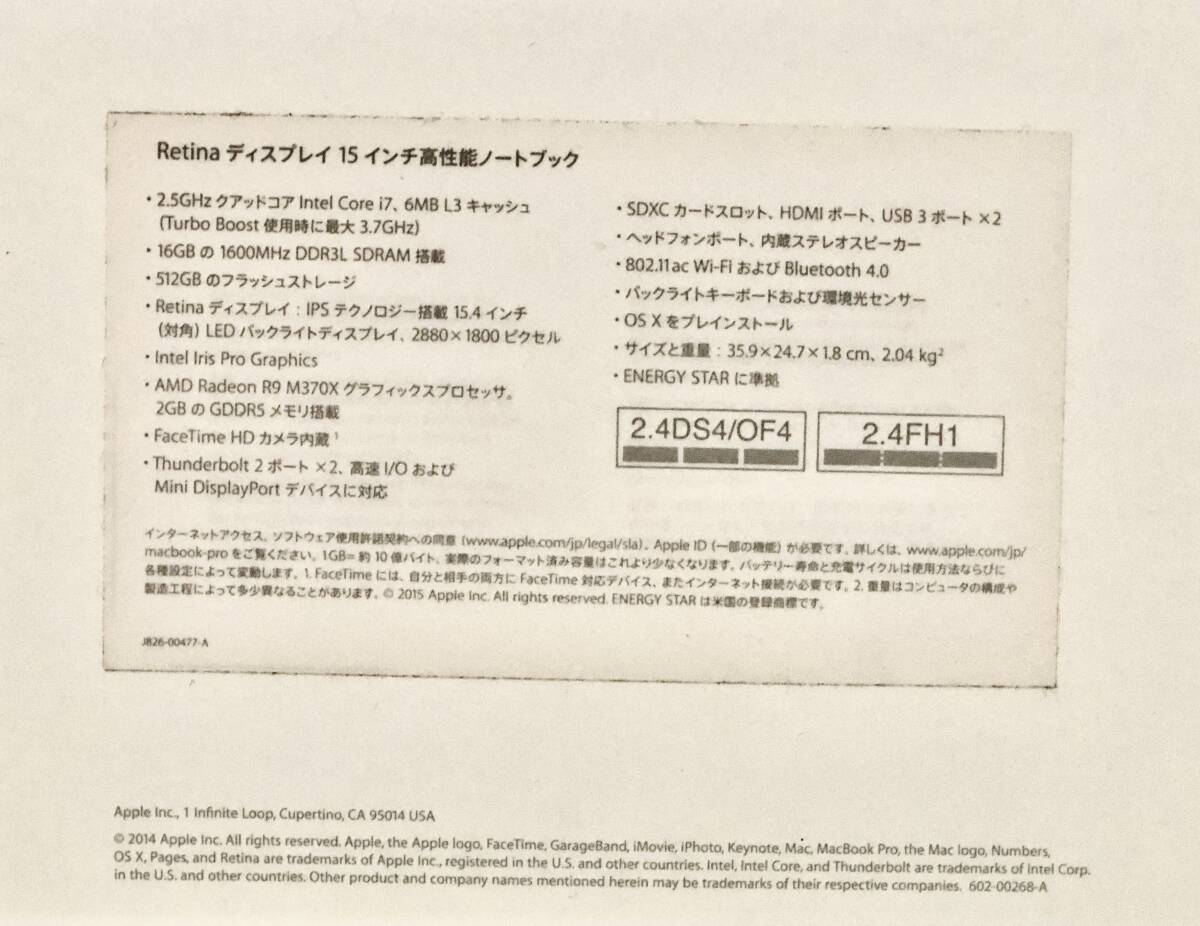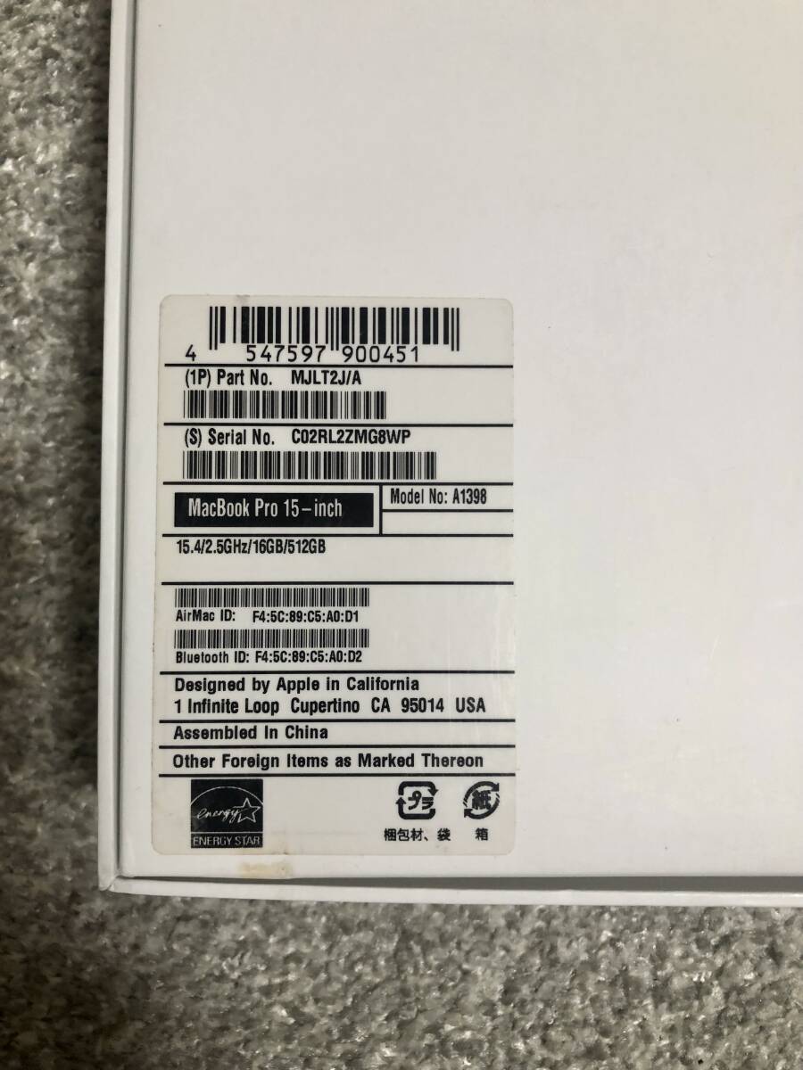 こちらは Apple MacBook Pro2015 15インチモデル A1398)純正の空箱 の出品です。