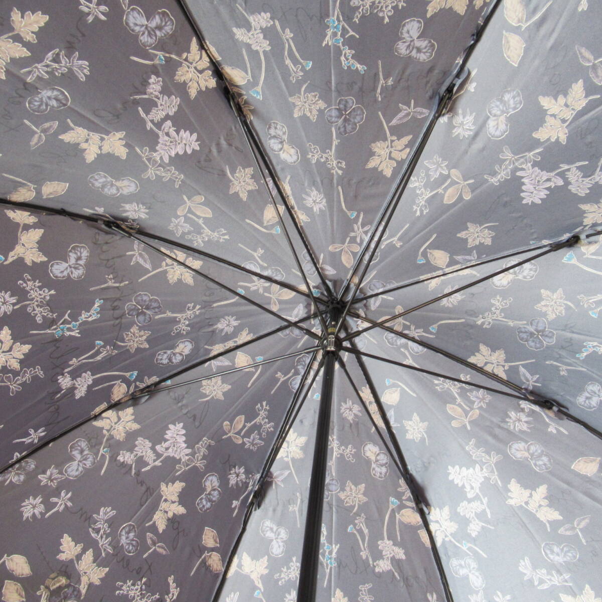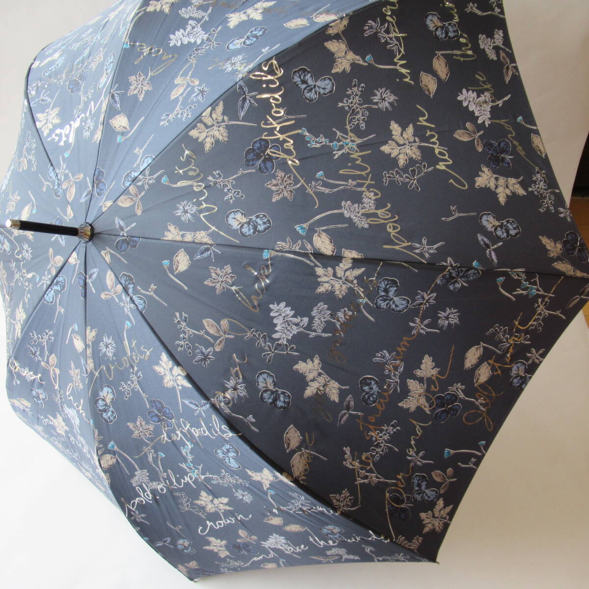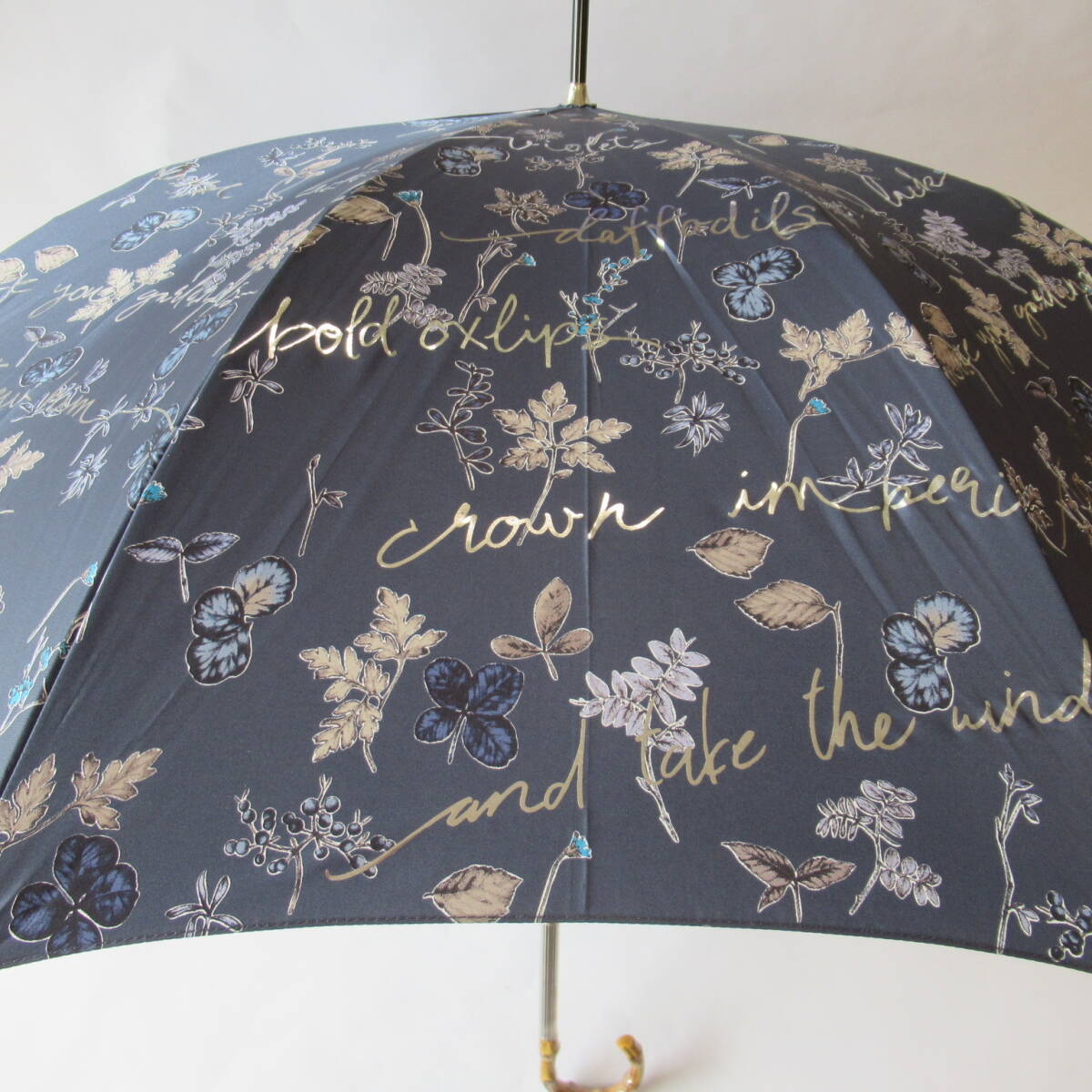 ボタニカル柄を押し花調にアレンジしたプリント雨傘です。きらめく箔プリントにレタードを加え、華やかに仕上げられています。憂鬱な雨の日がちょっぴり楽しくなるような傘です。バンブー(寒竹)を使用した手元もこだわりポイント。ロゴ入りの綿リボンをネームベルトに使用し、畳んだ時も可愛らしい傘です。