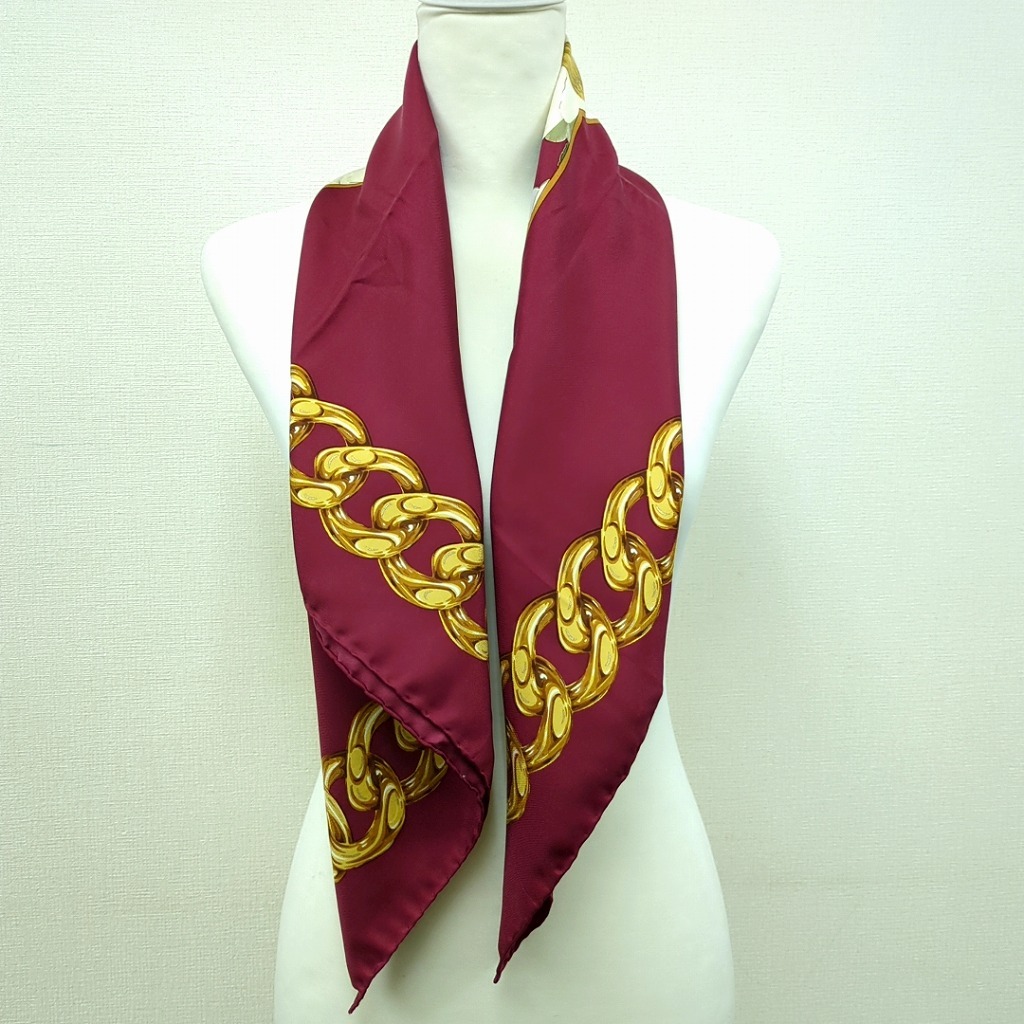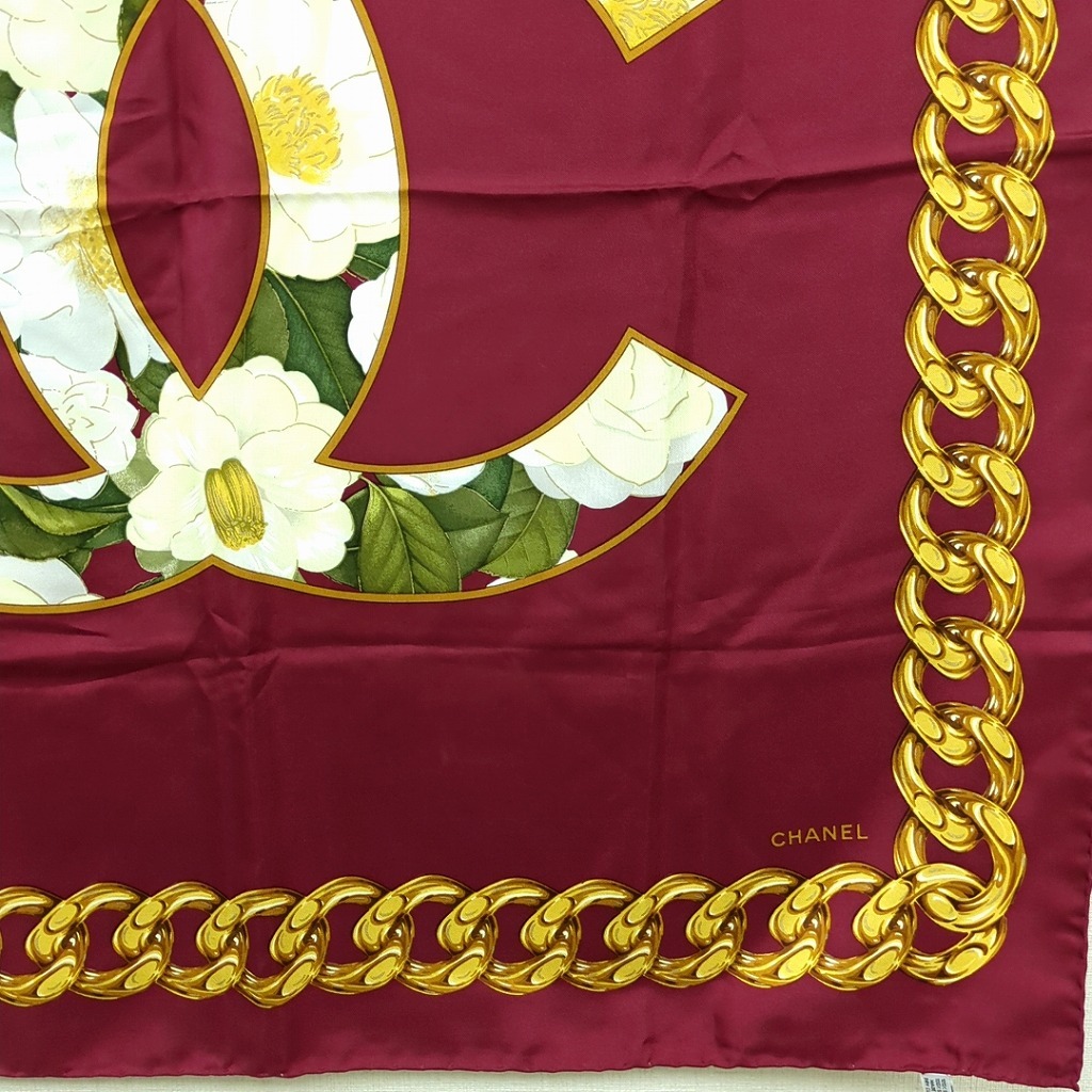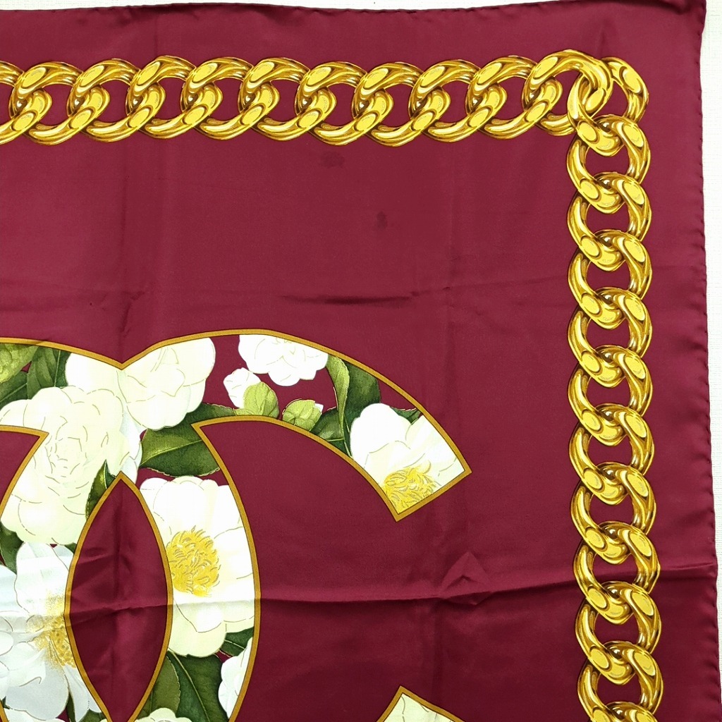 1006-2oji11550O シャネル ココマーク チェーン 花柄 シルクスカーフ ボルドー イタリア製 カラー:ボルドー、グリーン、ホワイト、ゴールドカラーなど 【コンディション】 ほつれと伝線、汚れがあります。 中古品ですので写真の状態をよくご覧ください。 【サイズ】 縦約87cm、横約85.5cm 多少の誤差はご了承ください。 【付属品】 なし
