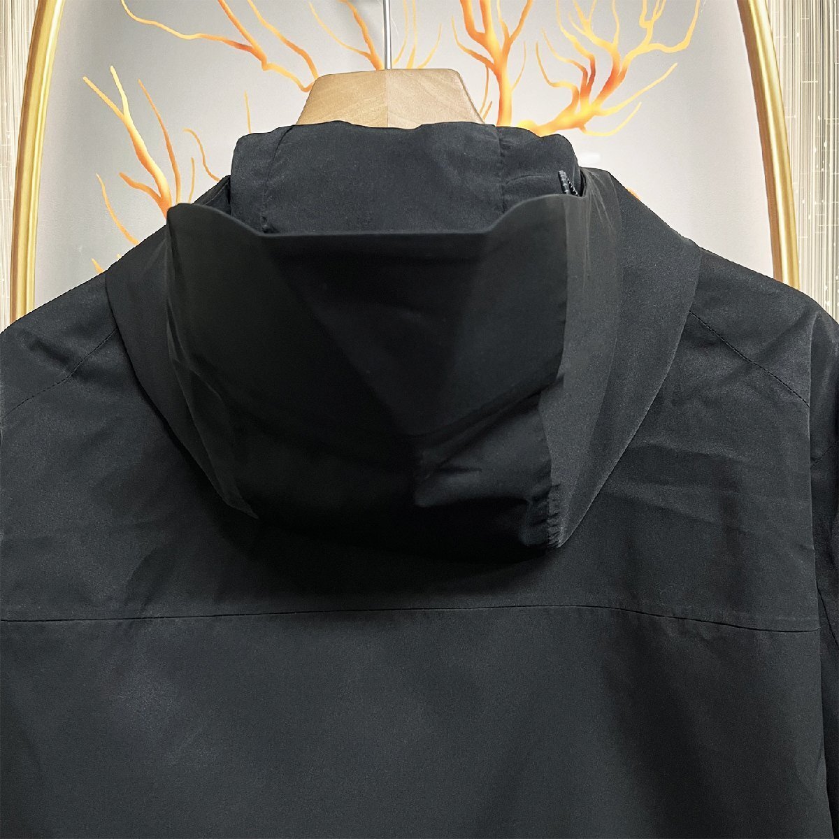 フードつば&ドローコードが付いており急な雨などの場合、顔をすっぽり覆い隠せます。両サイドにはストッパー付きのドローコードを備え、裾を絞ることで風の侵入を防ぎつつ、シルエットの変化も楽しめる実用的なディテールです。フロントはマジックテープとジッパーの二重構造で防風性を高め、外気の侵入を防ぎます。サイドポケットと胸ポケットには止水ファスナーを採用し、雨の日でも中の荷物を濡れずに保てます。