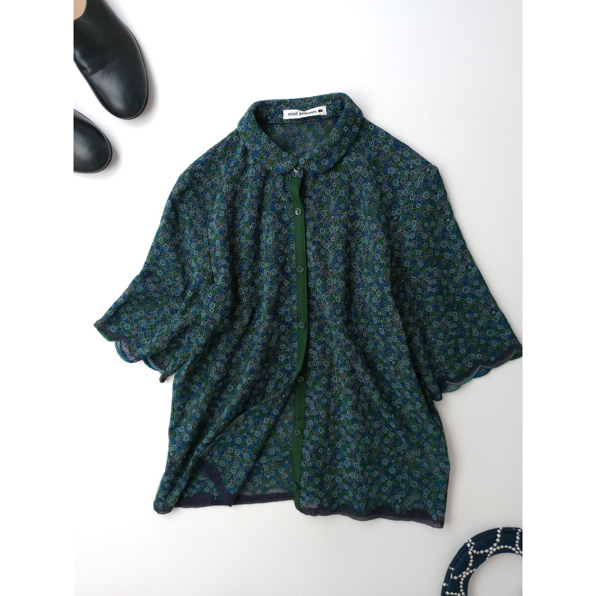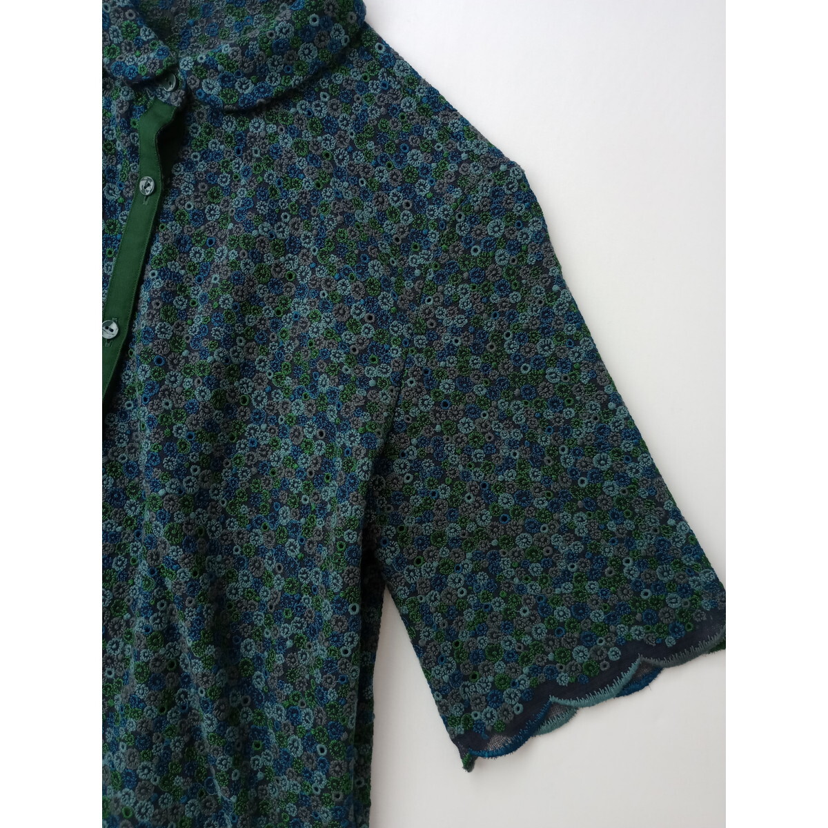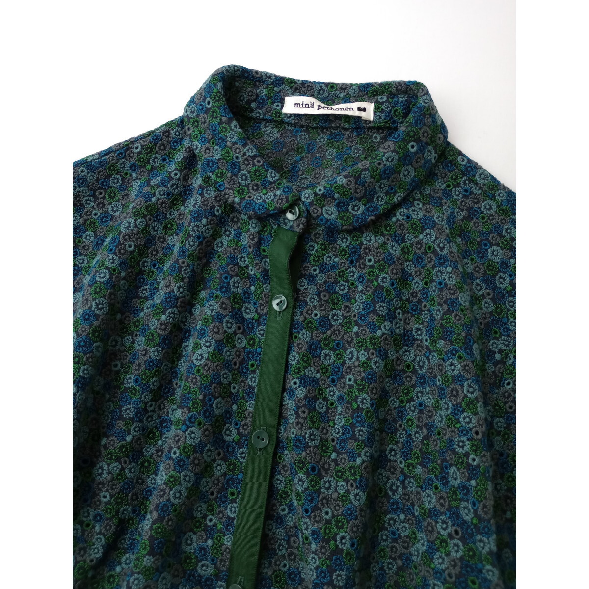 mina perhonen ミナペルホネン skyful 刺繍 スモールカラー 半袖 ブラウス シャツ グリーン 36