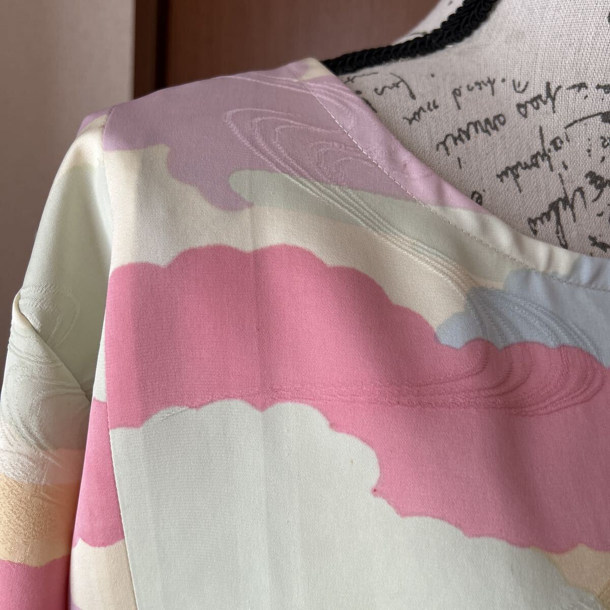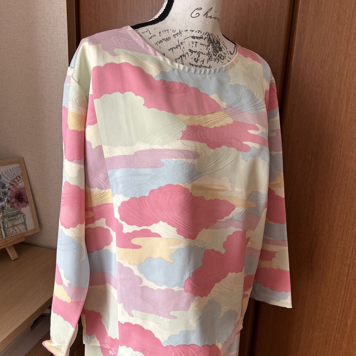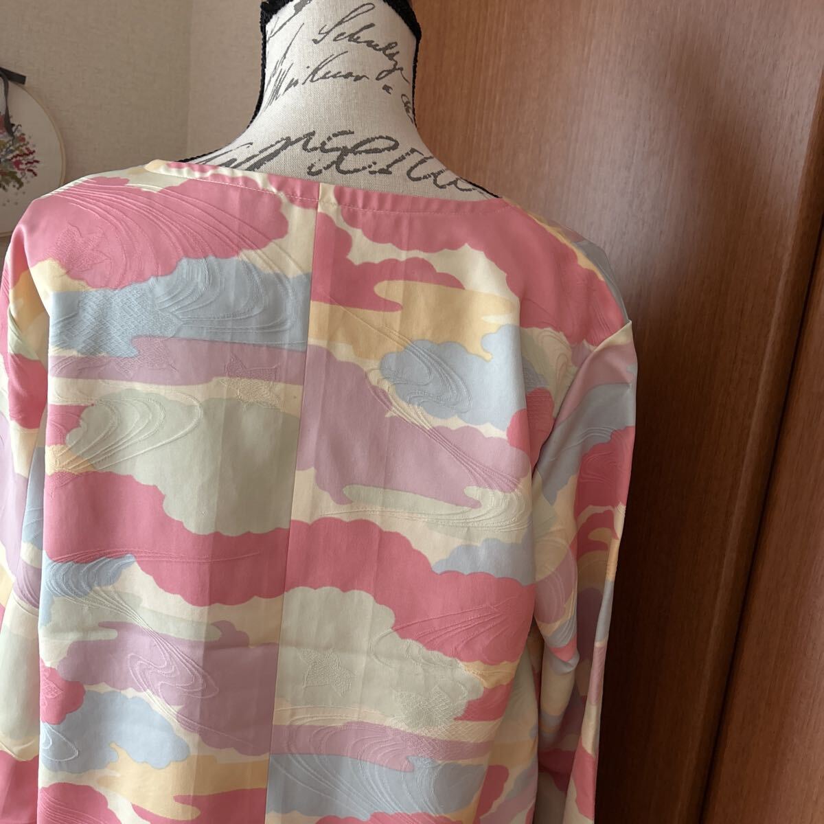 クリーム地にパステルカラーの雲柄の小紋を解いてホームクリーニング後仕立てました。