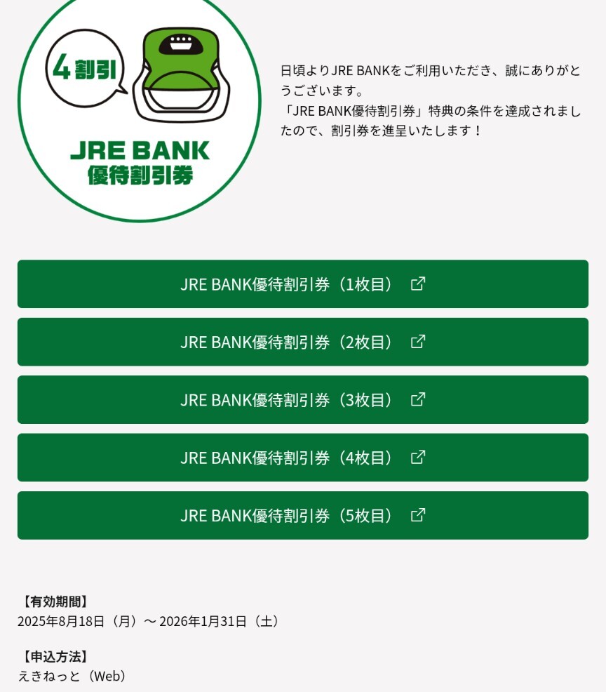 JR東日本 JRE BANK 優待割引券(4割引) 5枚