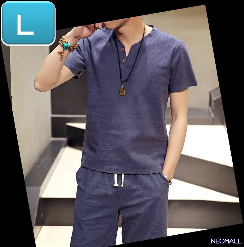 人気商品☆【276】 新品 サマーコットン ヘンリーネック セットアップ ブルーグレー Lサイズ 春 夏 部屋着 ルームウエア