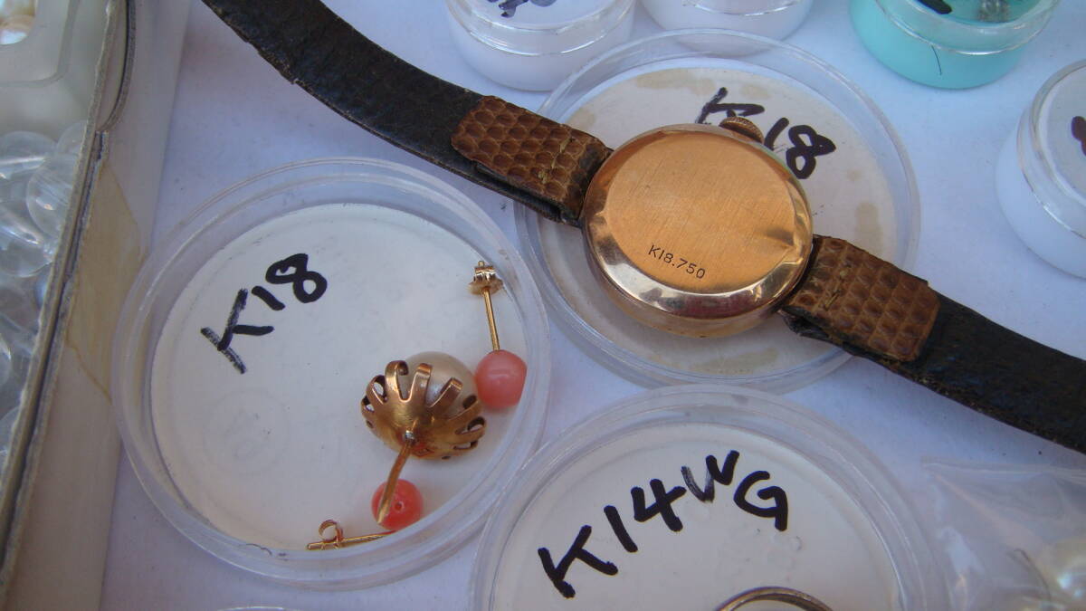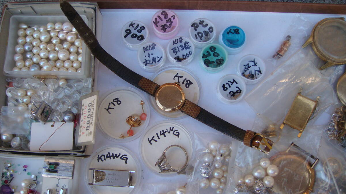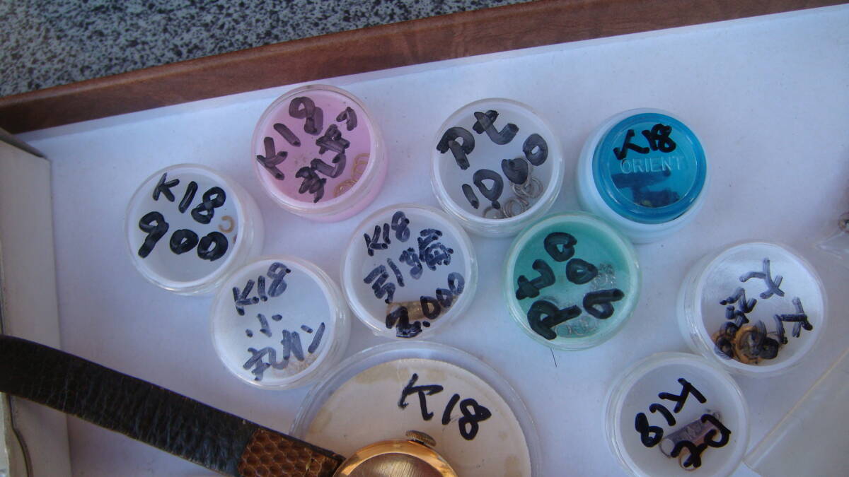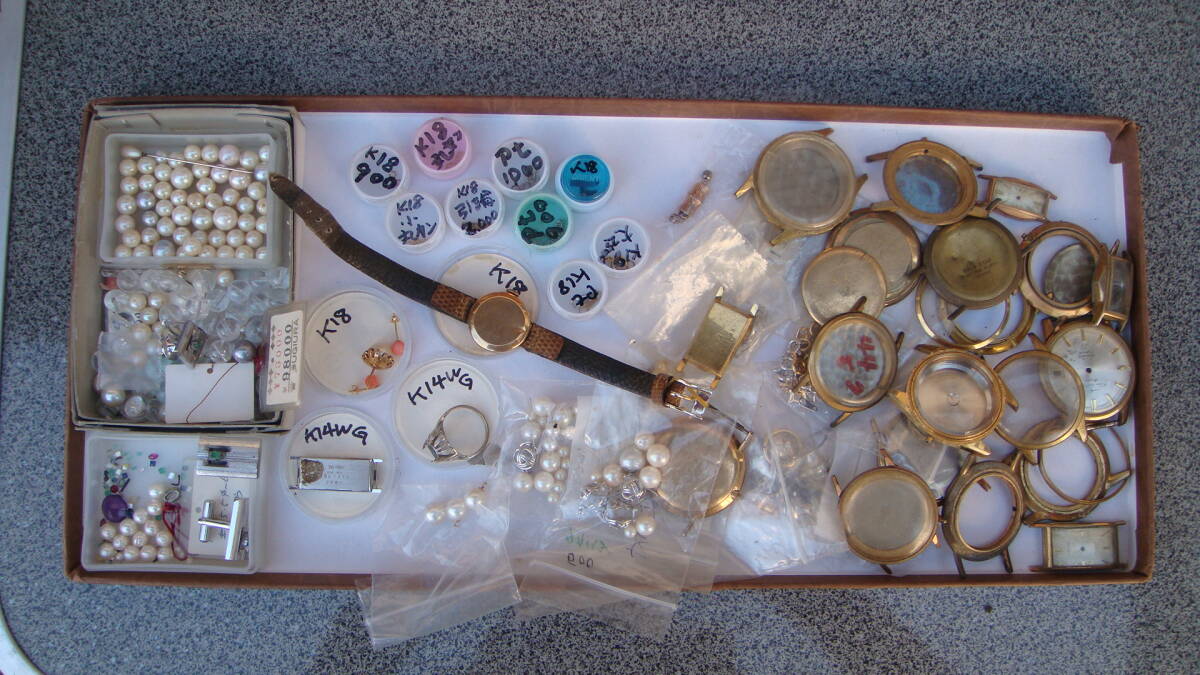 時計部品など、金分析用にストックしていたものです。 小さいボックスのものは4g位あると思います K18・K14とあるものは刻印を確認しています。 アンティーク手巻きオリンパスも動きています。 1,000円からスタートのジャンク出品です 状態についての保証は一切いたしません。 NCNRご理解いただける方の入札をお待ちしています。 年数経過あり、傷や汚れなどあるものとお考え下さい。 経年による劣化が考えられます、ご理解の上ご検討ください。 外観については写真にてご確認ください。 経年による劣化、スレやヨゴレなどついていることがあります。 商品画像に写らないイタミ、キズ、汚れがついている場合あります。 完璧なものを求める方、神経質や細かいことが気になる方はご遠慮ください。 商品の状態の項目は主観のため目安程度に捉えてください。 状態については写真や説明文を確認ください。 説明に記載されていないことがらは未チェックとお考え下さい。 思っていたものと違った。 記載がなかったので当然こうだと思った。 上記のような問い合わせが最近また増えております。(対応しません) ※ジャンク品のまとめなどはすべてチェックしきれませんのでジャンクとして出品しています。 思いがけないものが入っていることも多々ありますが、その中の1点を狙っての入札はおすすめしません。 (殆どの場合思ってたものと違うという結果になると思います) 商品の性質上いかなる場合もNCNRです。 ご理解のうえ入札ください。 現状でのお渡しになります。 年数が経過している商品です。 説明、写真を参照いただき、商品の特性を理解していただいたうえでのご入札をいただければ幸いです。 ノークレームノーリターンでお願いします。 画面上の色はモニタなどの環境によって実際の商品とは多少色や質感が異なって見えることがありますのでご注意ください。 他にも時計関連をはじめ、いろいろな商品を出品しております。 ぜひ当方のオークションをご覧ください。 | |