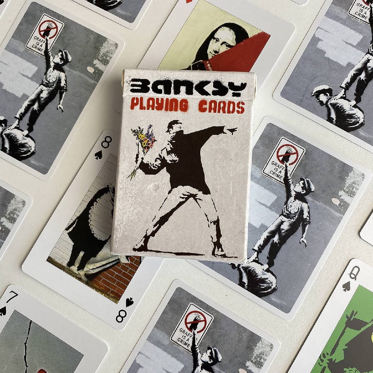 世界を魅了する謎めいたストリートアーティスト「バンクシー」の作品を日常で楽しめる「Banksy Playing Cards」のご紹介です。バンクシーは機知に富んだ社会批評と謎めいた匿名性によって世界的な名声を獲得している、現代アートシーンにおいて重要な位置を占めるアーティストです。彼の印象的なウォールペイントやプリント作品が、このデッキのすべてのカードに採用されています。