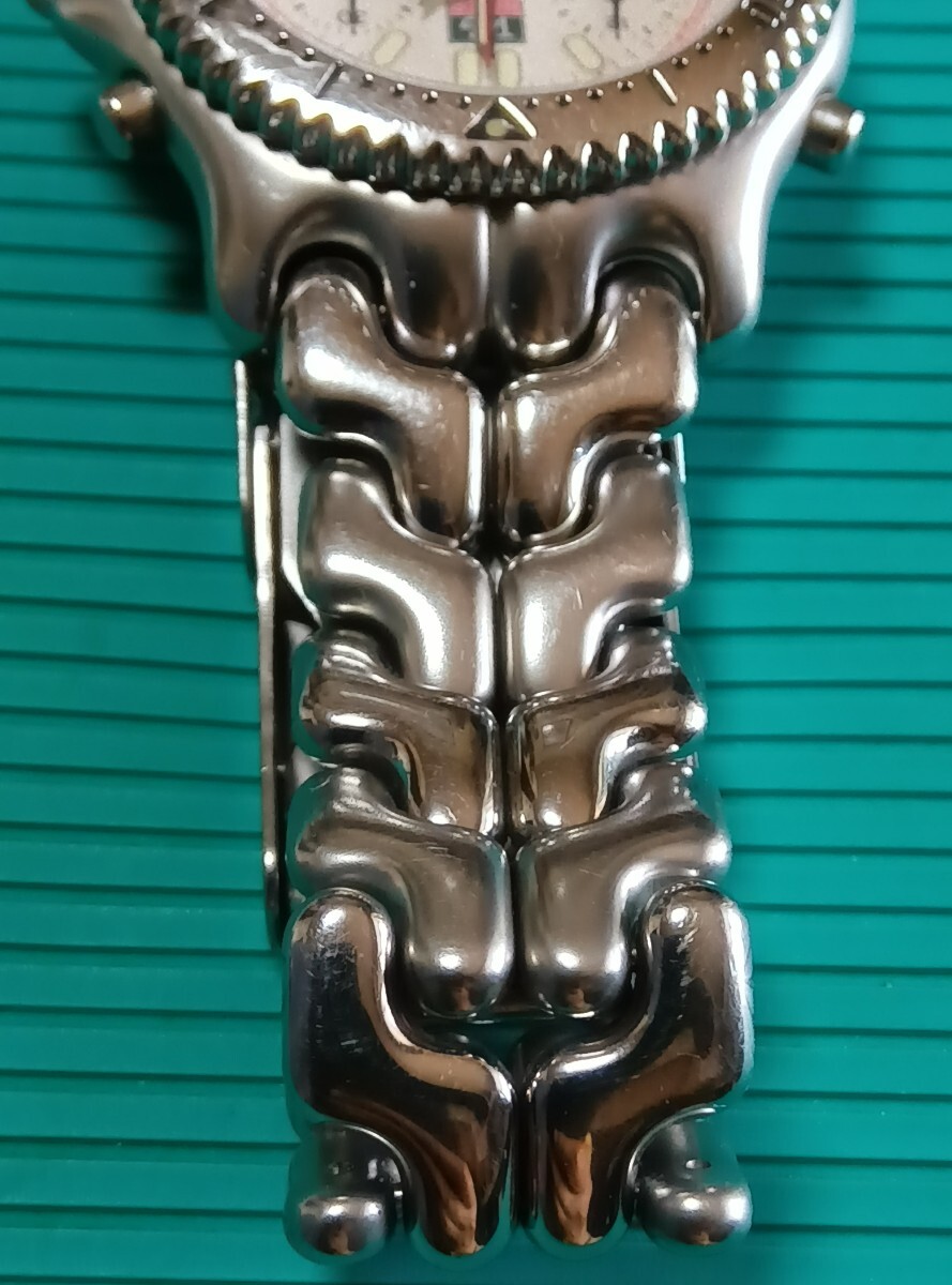 ※ 難あり部→ c.ストップウォッチモード 動かない時が多々あるのでラップタイムを2〜3回きざんで4時位置ボタンを押す(ソフトタッチで).黒針が12時位置に戻らない時は、竜頭を1段ひいて8時位置のボタンを押して戻します。