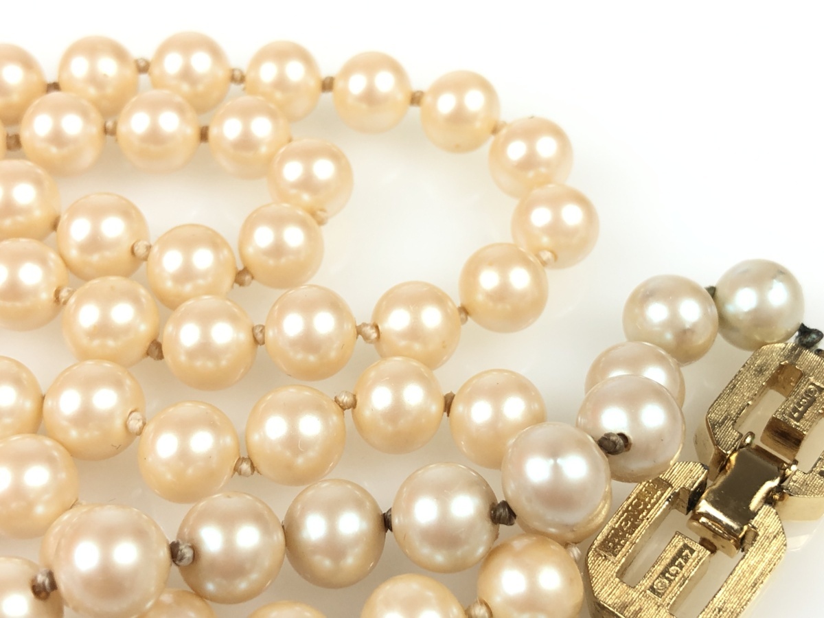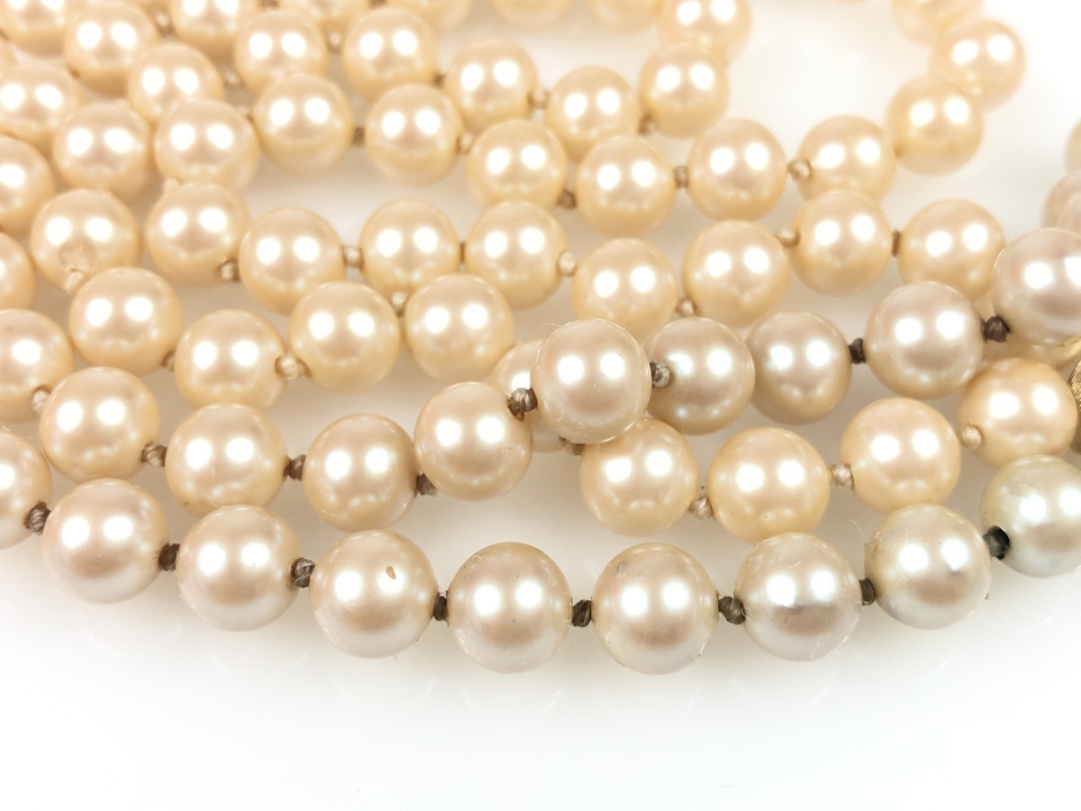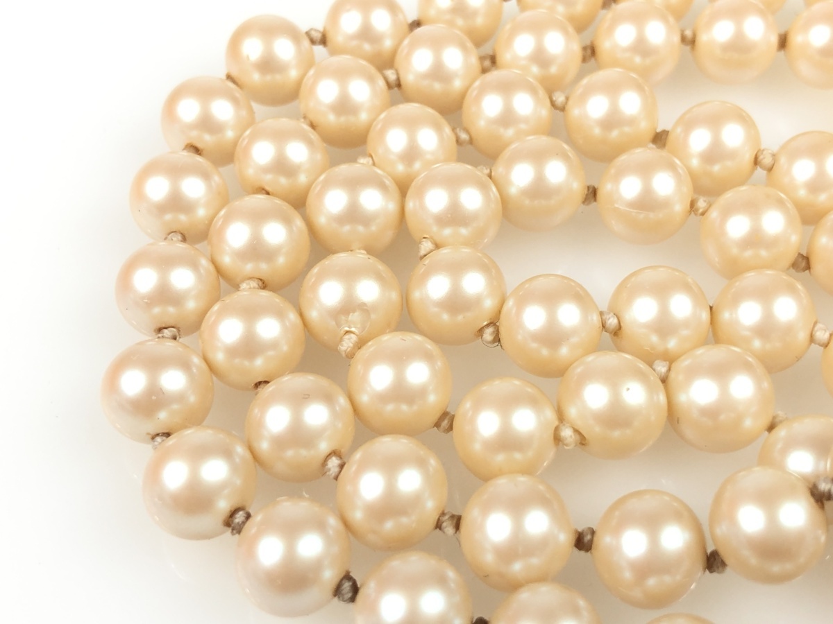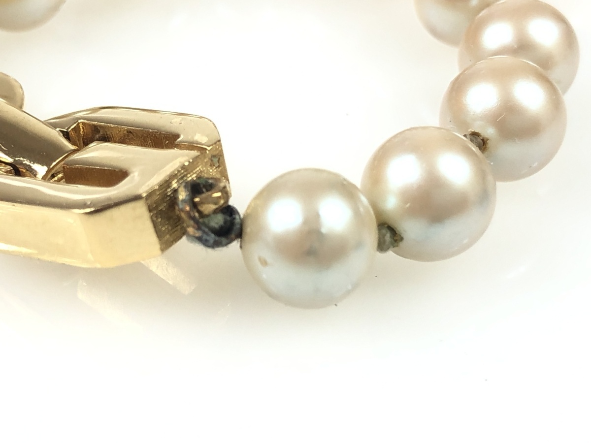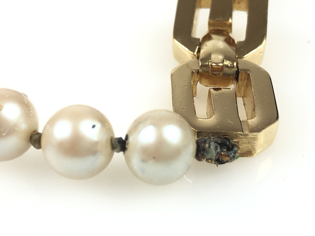 留め具、付近に緑青のヨゴレあり。留め具~約5㎝部分までパールの色変わりが見られます。(画像でもご確認ください)