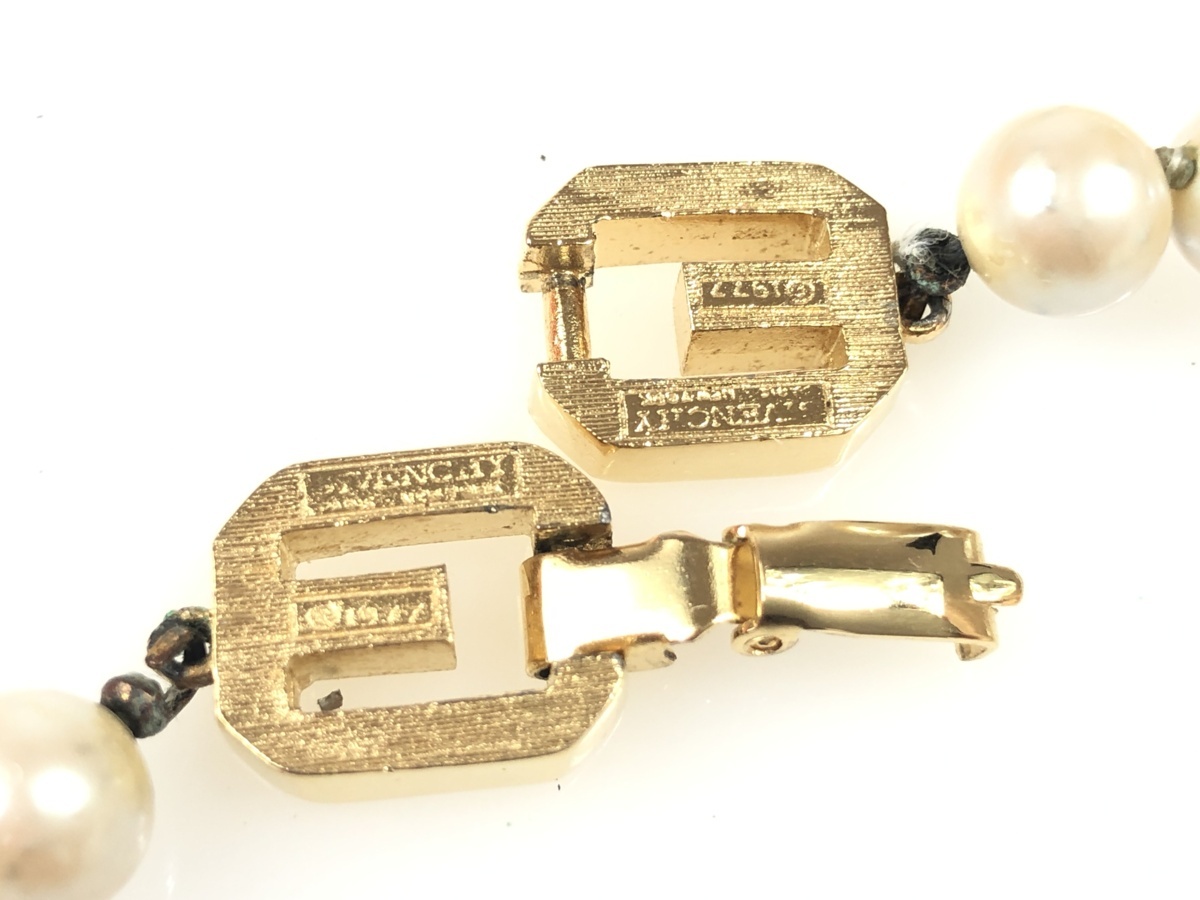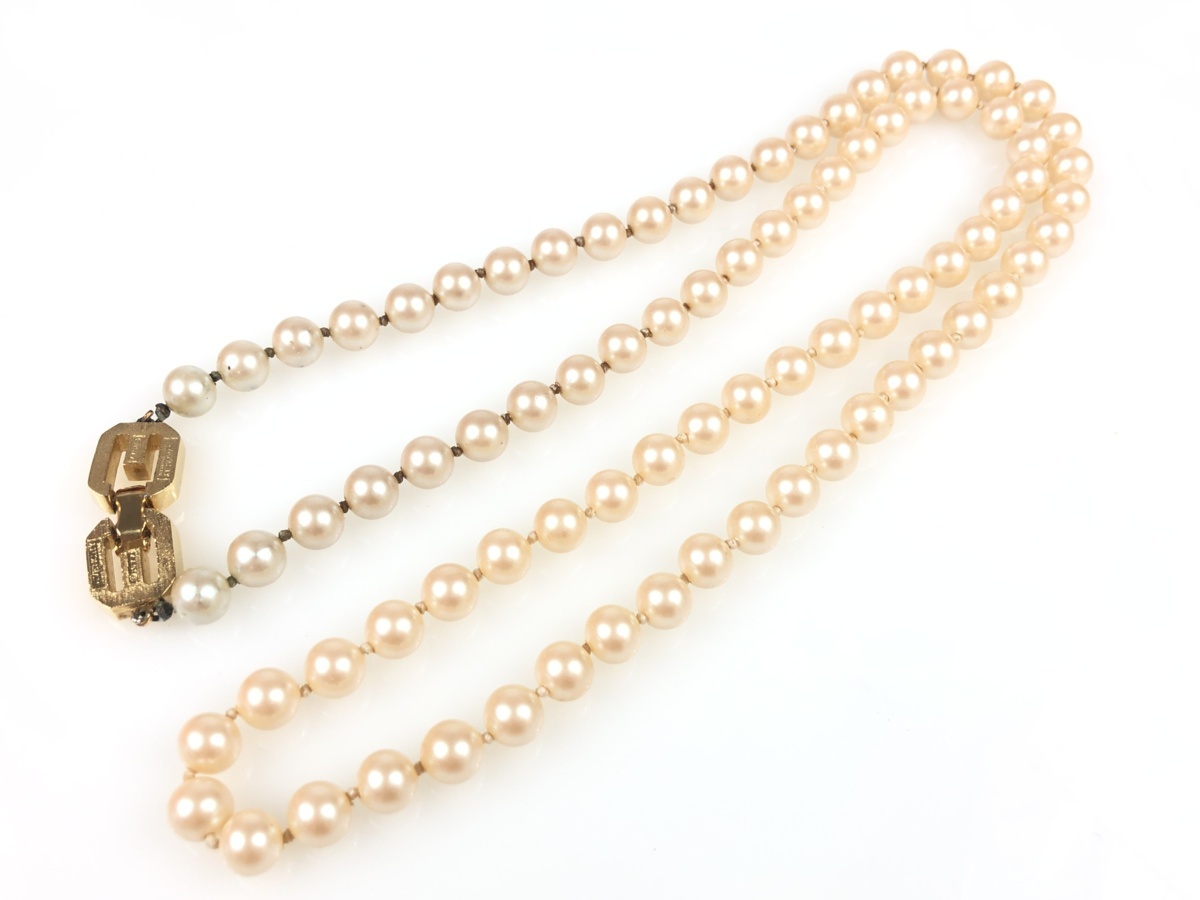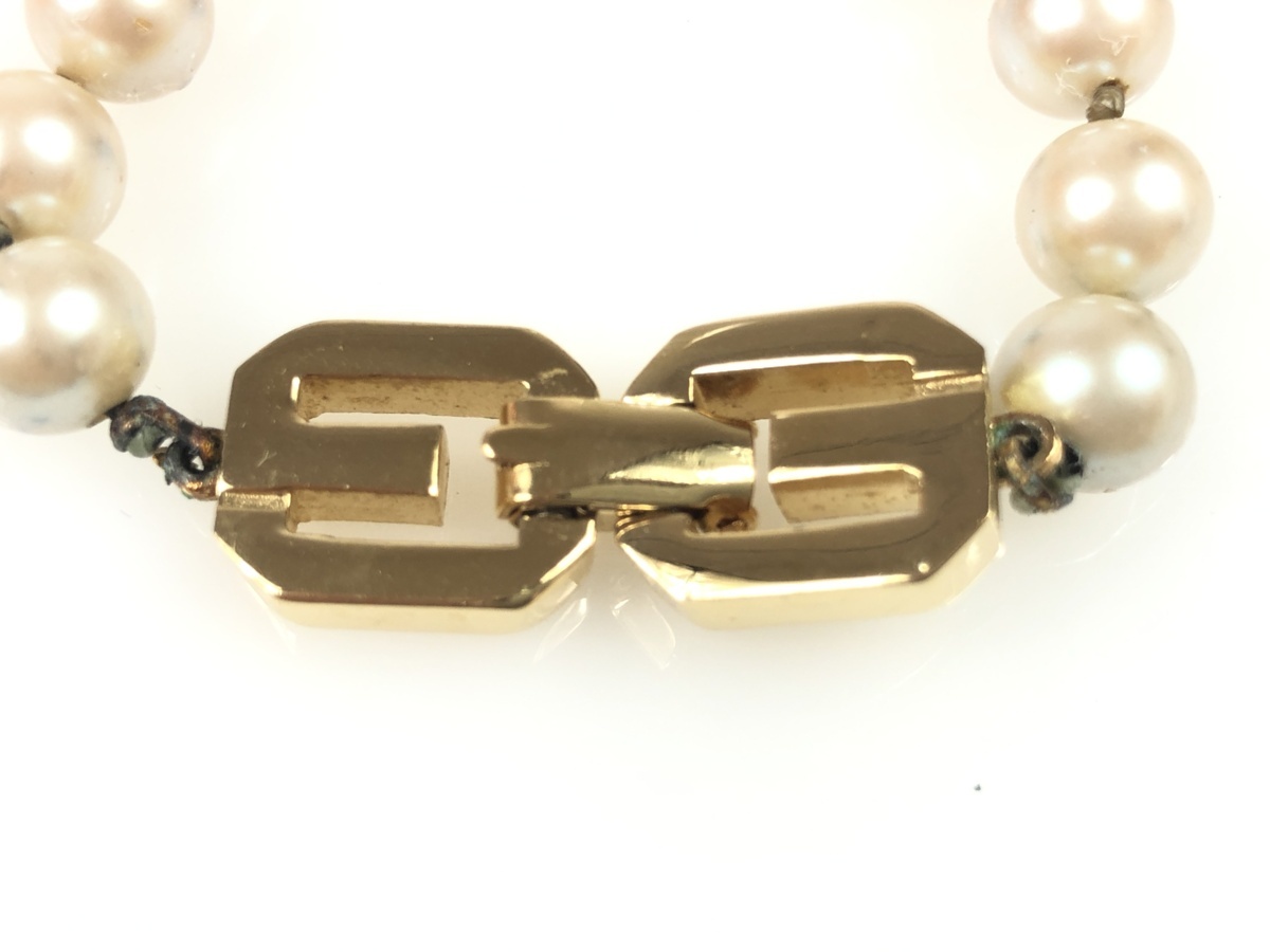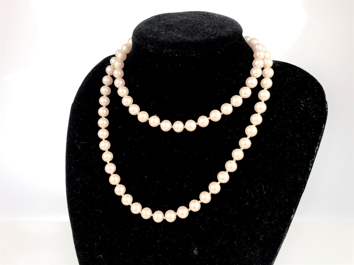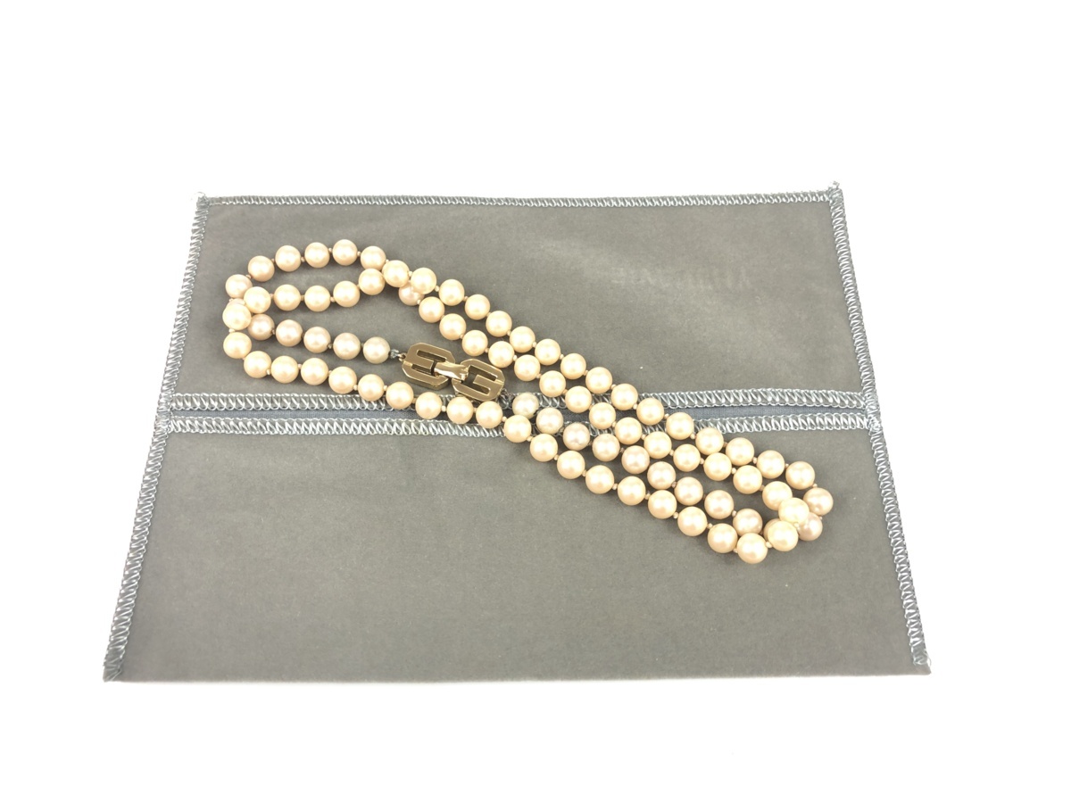 留め具、付近に緑青のヨゴレあり。留め具~約5㎝部分までパールの色変わりが見られます。(画像でもご確認ください)