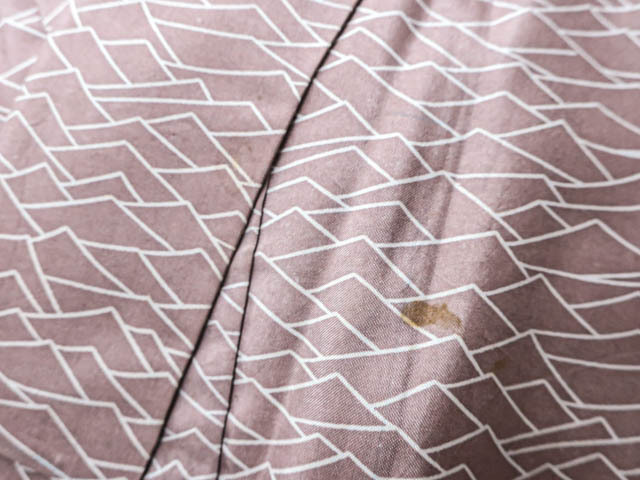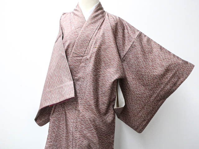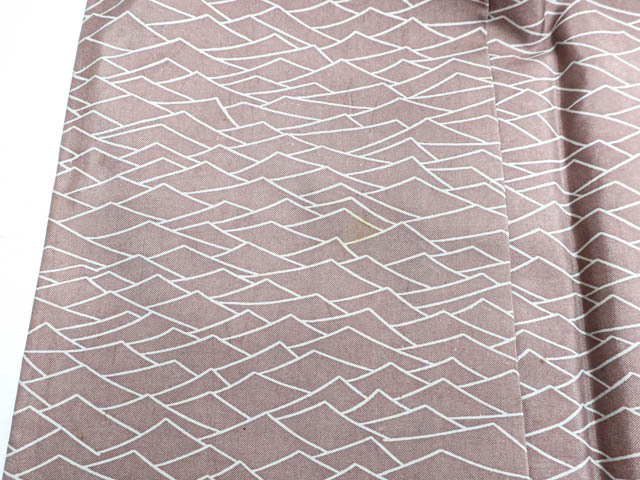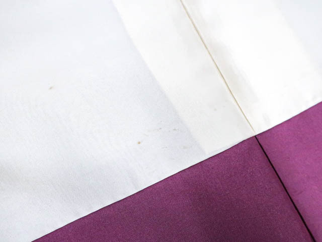 リサイクル商品のため、胴裏、衿に汚れ、両衽や下前身頃などにシミがございますが着用可能なお品です。 地色は、くすみ紫色です。 1枚目の画像が近いお色かと思われます。 素材は正絹です。 |