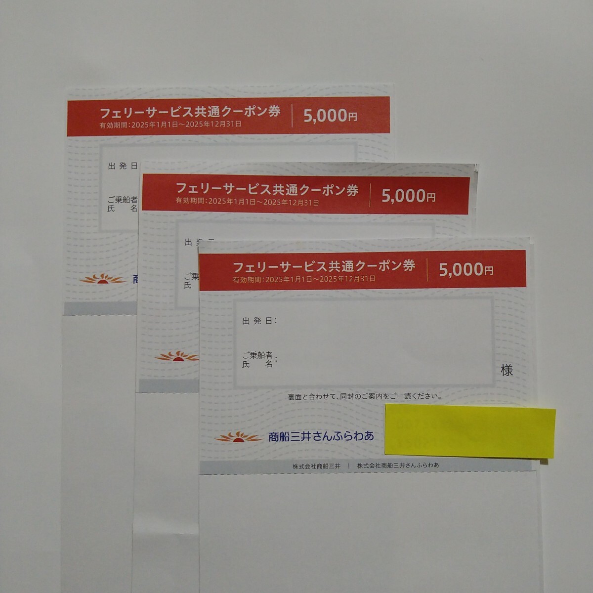商船三井株主優待 さんふらわあ フェリーサービス共通クーポン券5000円3枚 、有効期限2025年12月31日 株主以外利用可 の出品となります。