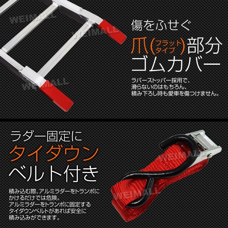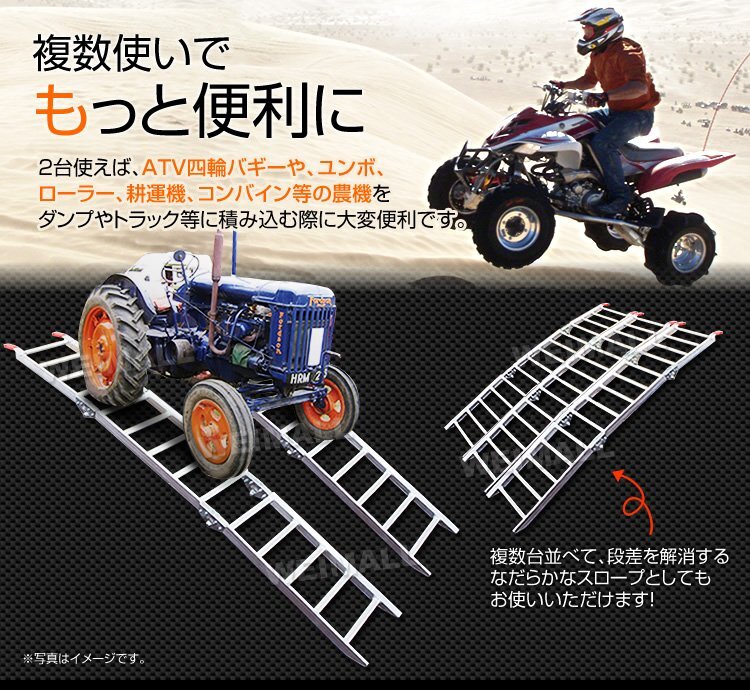 超軽量アルミラダー! ATV四輪バギー・ダンプやトラック等にユンボやローラー・耕運機・バイクなどを 積込みする為の折りたたみ式アルミラダーです。 車高の低い積込み時に、とても役に立ちます。 軽量加工、滑り止め加工、脱落防止のタイダウンベルトもついております。 折りたたみ部分や地面接続部分を補強加工しておりますので、より重いものでも耐えられるようになりました。 【商品仕様】 仕様:折りたたみ式 サイズ:全長199cm×幅30.5cm 耐荷重:270kg 重量:5.1kg 素材:アルミ 付属品:タイダウンベルト ※訳あり品のため、即日発送できない場合があります。 ※出荷前検品により、発送が困難であると判断した場合は、ご注文をキャンセルさせていただく場合がございます。 【訳あり品の注意事項】※必ずご確認ください ・お安く提供しておりますのでご了承の上、ご入札をお願いします。 ・落札個数分の送料が必要となります。 ・通常の商品とは異なり、保証期間はございません。 ・組み立てに必要なボルトナット類(組立パーツ)が不足している場合は、お客様でご用意お願いいたします。 ・細かなことが気になる神経質な方は、ご入札はお控えください。 ・訳あり部分の整備、修繕や調整が可能な方のご入札をお待ちしております。 ・訳あり品はその性質上、再入荷のお約束ができません。 ・販売価格は随時見直しを行い、事前の予告なく変更いたします。 ・本商品を使用した際に発生したトラブル、事故につきまして、当社は一切の責任を負いかねます。 ・人身および物損事故のないように十分ご注意ください。 ・商品は、モニターによって色合いが異なって見える場合があります。 ノークレーム・ノーリターンでお願いいたします。 ・訳あり品ですので、いかなる場合もノークレーム/ノーリターンでお願いします。 |