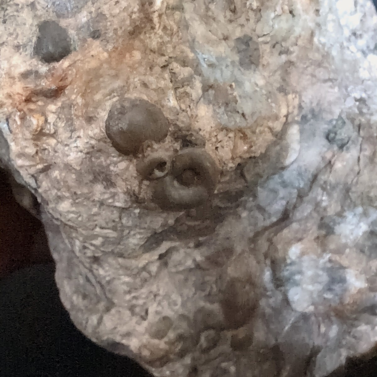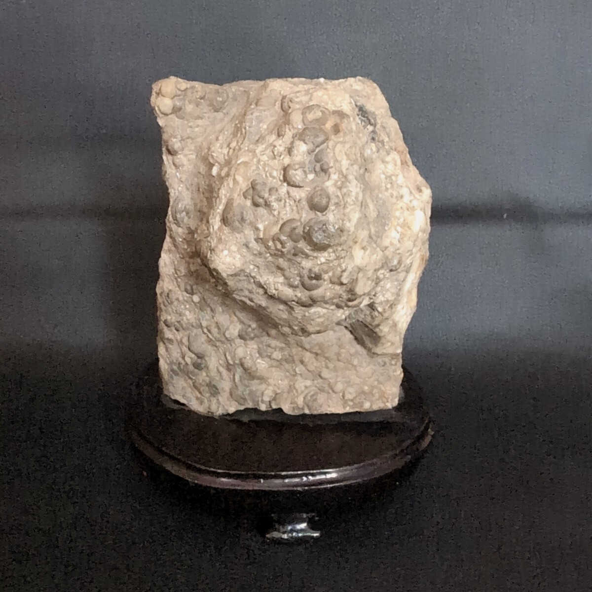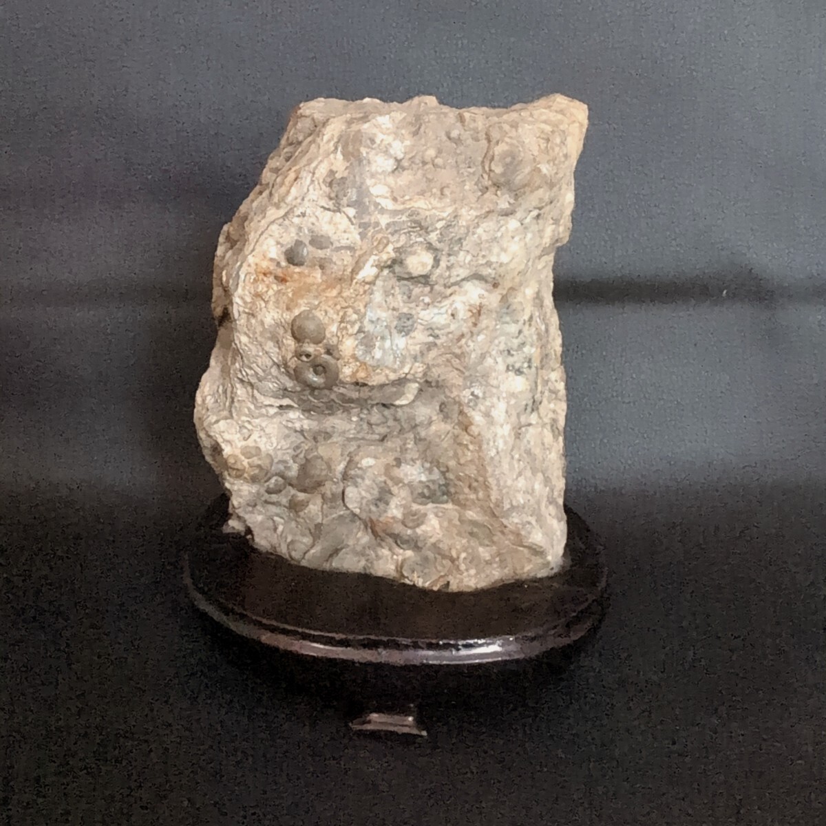 流紋岩の中のそろばん玉石とよく見ると多数小さいアンモナイトが噛んでいて珍しいと思います