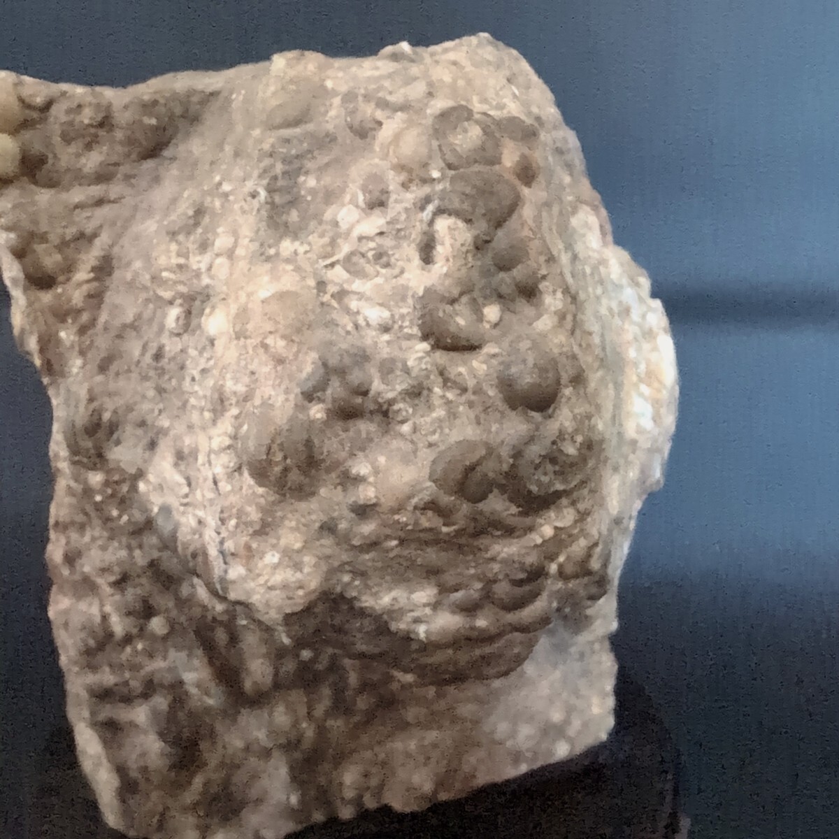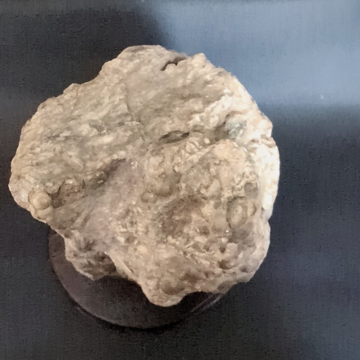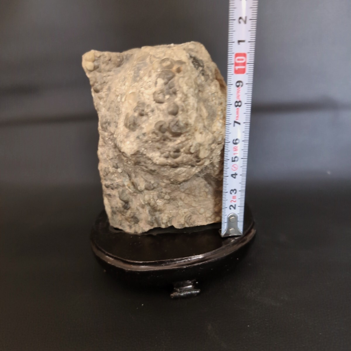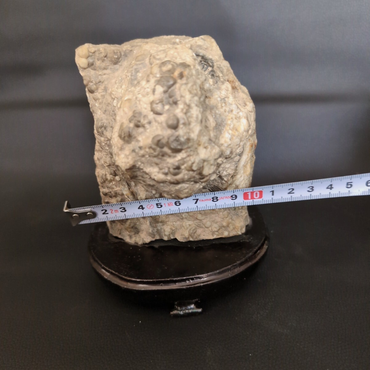 流紋岩の中のそろばん玉石とよく見ると多数小さいアンモナイトが噛んでいて珍しいと思います