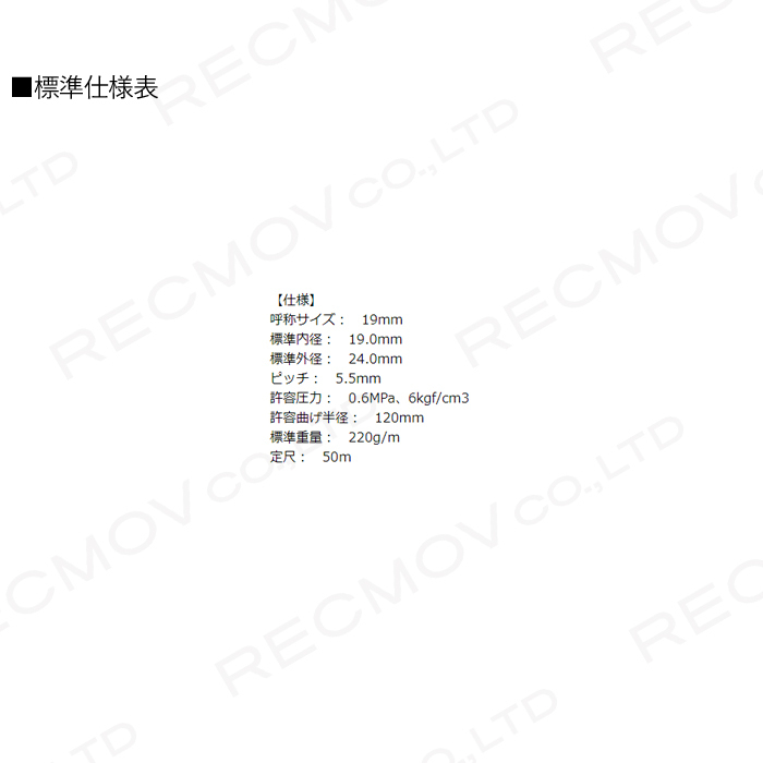 カクイチ サクションホース インダスGM 内径19mm×外径24mm×50M巻 透明 呼称サイズ: 19mm 標準内径: 19.0mm 標準外径: 24.0mm ピッチ: 5.5mm 許容圧力: 0.6MPa、6kgf/cm3 許容曲げ半径: 120mm 標準重量: 220g/m 定尺: 50m