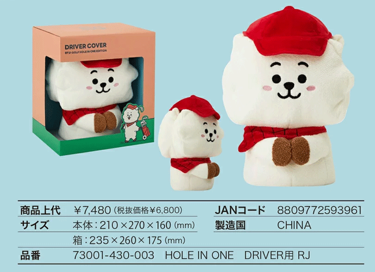 【商品特徴】 <BT21ゴルフアイテム 「ホールインワン」シリーズ!> ゴルファーになったBT21がフィールドに登場。 【商品詳細】 ●状態:新品・未使用品 ●材質:ポリエステル ●タイプ:ドライバー用(460cc 対応) ●サイズ:210x270x160 mm ※特殊なヘッド形状の場合は、装着できないことがございます。 ※撮影時の光量の具合や、ご覧いただいております画面環境によりまして、実際の商品と若干色味が違う場合がございます。 ※商品詳細のスペック値はメーカー表記の数値となりますが、個体差による若干の公差がございます。