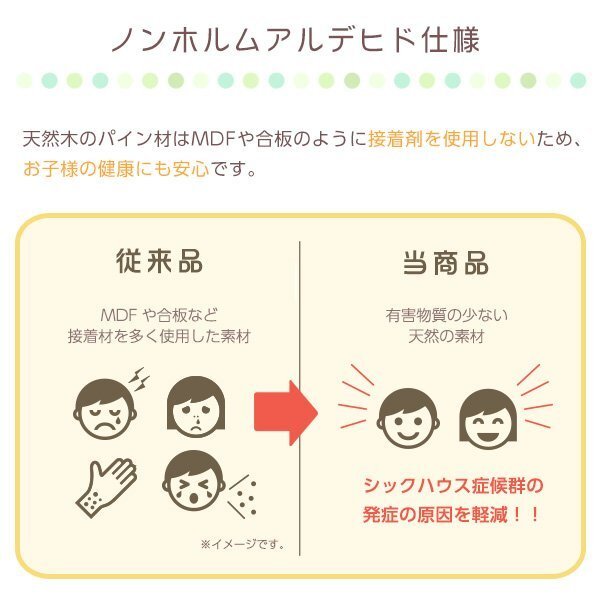 | 場所を取らないコンパクトサイズのキッズチェア! 丈夫な天然パイン材フレームで安心設計です。 座面は高さ調節可能でお手入れ簡単です。 カラーは3色展開です。 |
