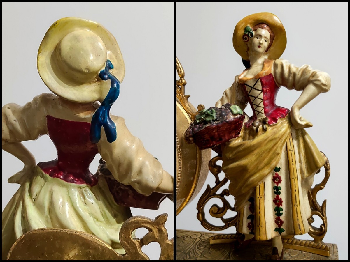 金属フレームは細かな傷や変色が見られる箇所もあります。白いフレームに塗装剥がれが見られる部分があり、汚れもあります。人形も全体的に汚れがあります。状態についてはお写真にてご確認ください。