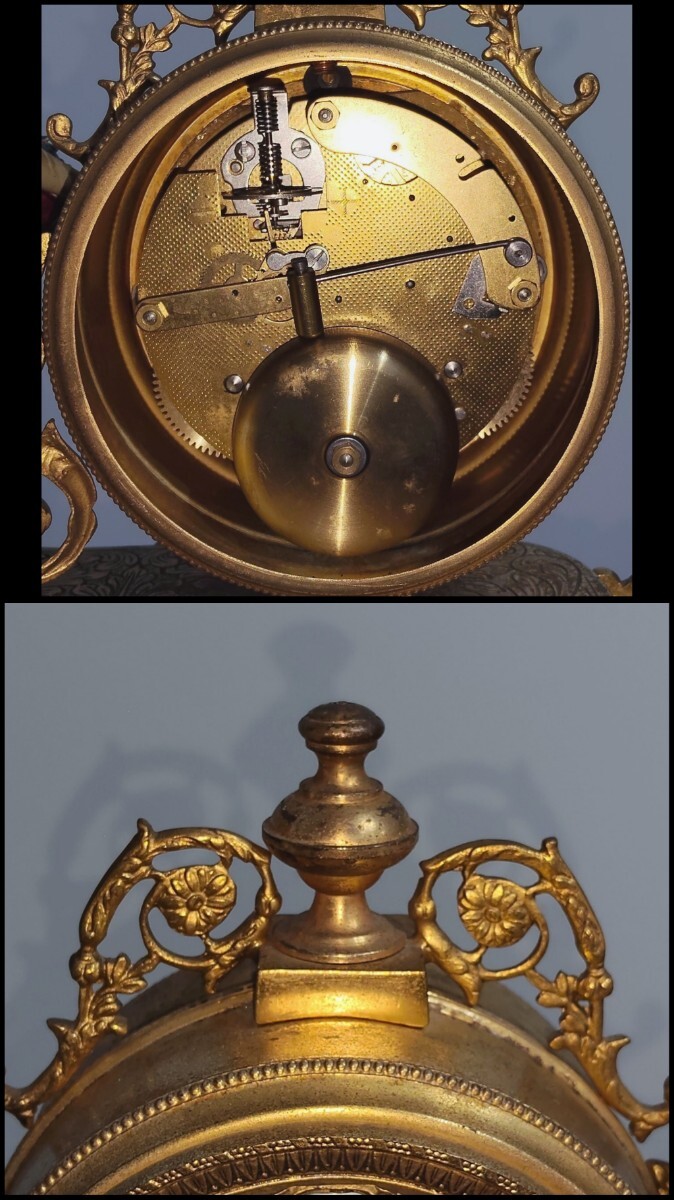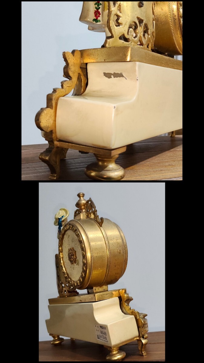 ゴールドカラーのフレームは金属製となります。とても重たい置時計です。フランス製の置時計と似ていますが刻印がないため製造国や年代は不明とさせていただきます。蓋裏に刻印がありますが、こちらも詳しい情報は不明です。