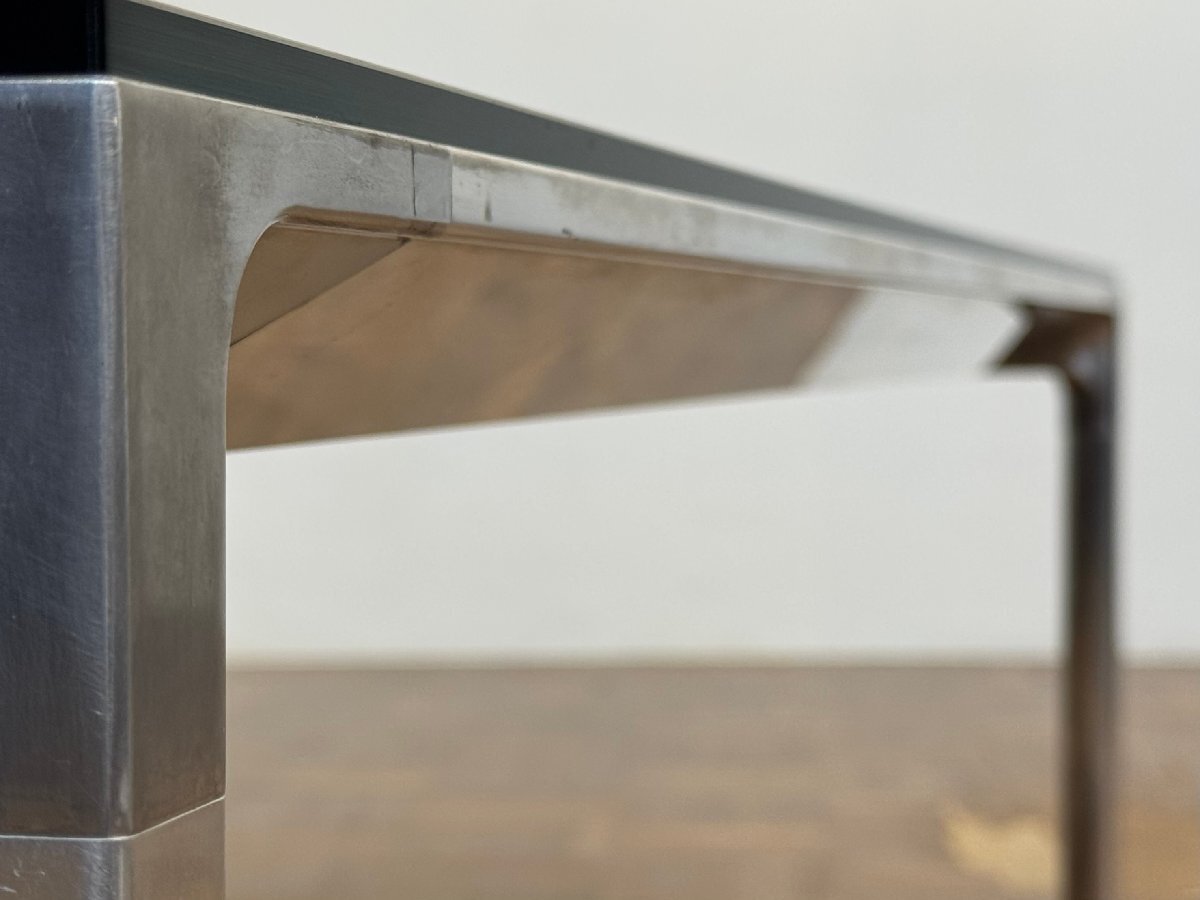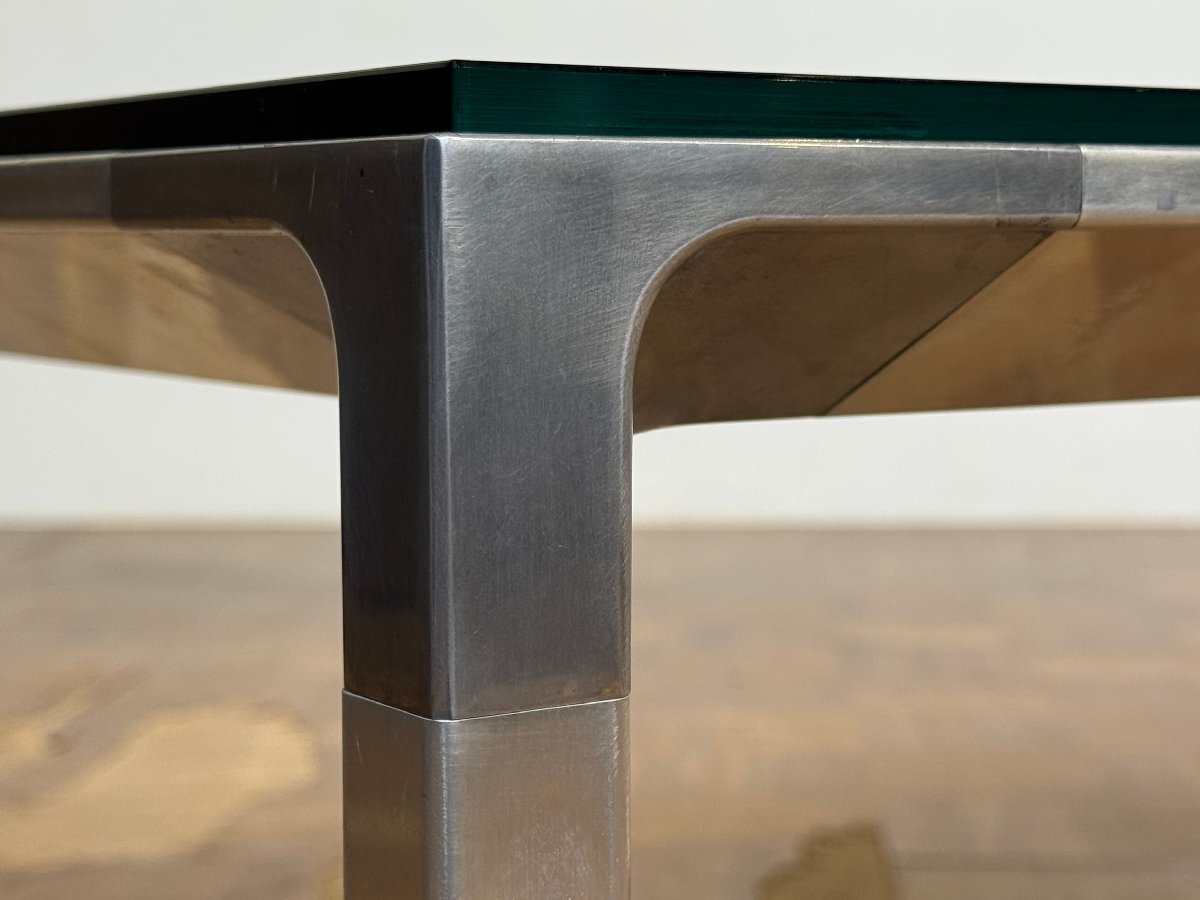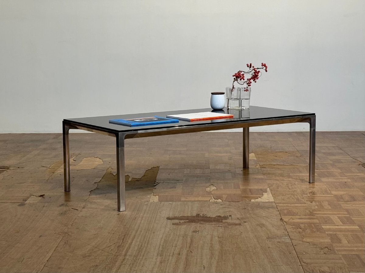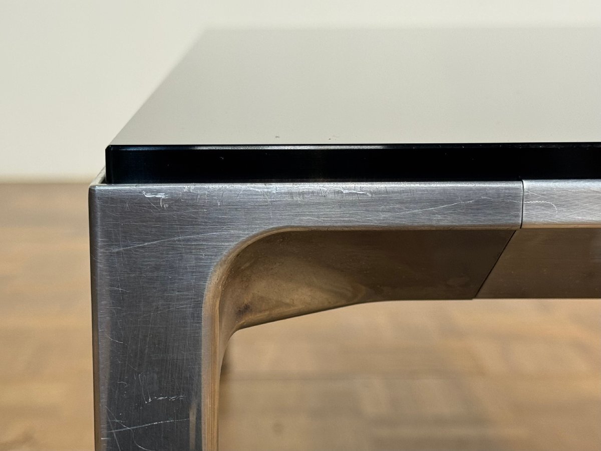 直線的なデザインにガラストップとアルミダイキャスト製の堅牢ながら軽やかなカットラインで素材感の美しさを謳い上げた、ブランドを代表するリビングテーブル。Cassina ixc. より。