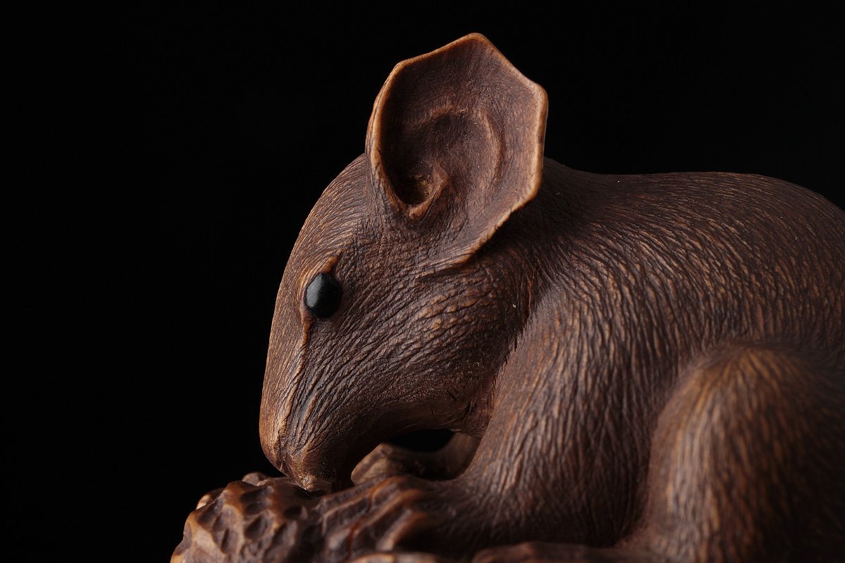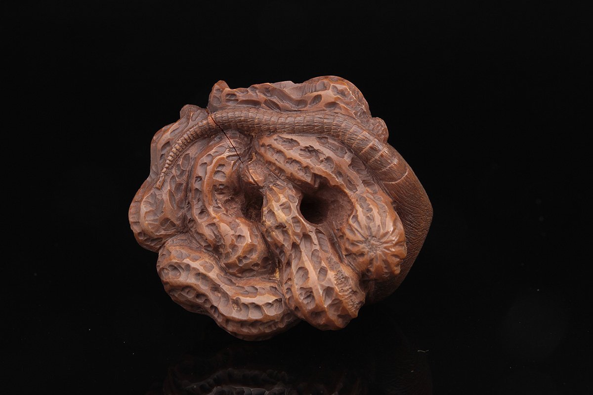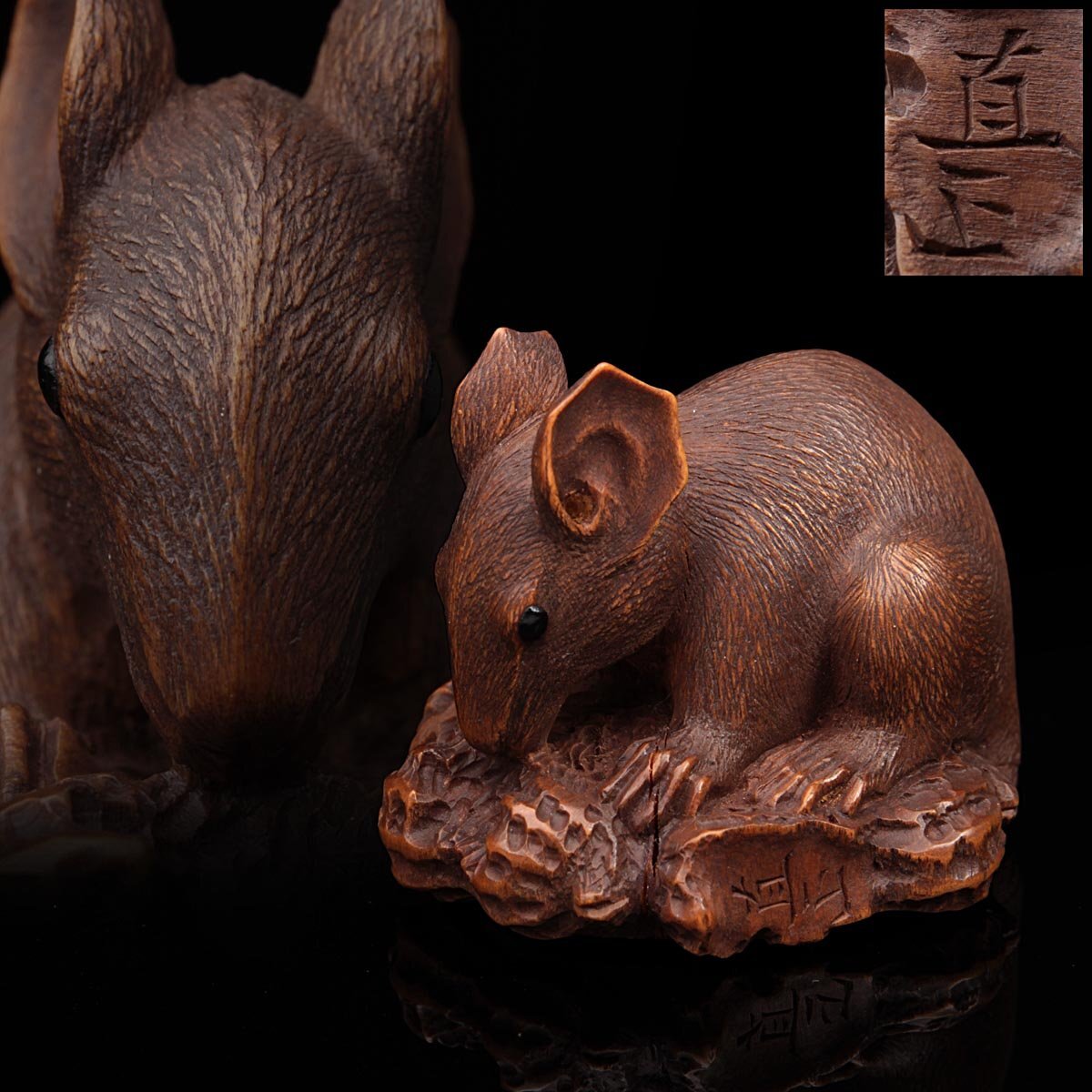 ◆ 時代提げ物【直正 銘】古黄楊木彫「落花生に鼠」根付・古柘植根付・形彫根付 印籠 煙草入 装飾品 古美術 ◆
