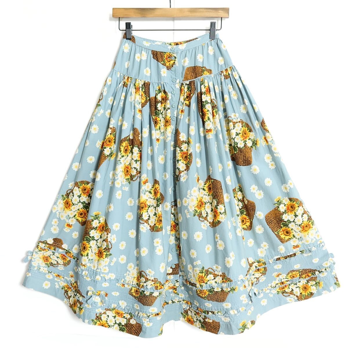 商品説明 | 【実寸約】ウエスト61丈83(cm) 【サイズ表記】 タグなしのため不明。実寸をご参照くださいませ。 【素材】 タグなしのため不明。 綿100%と思われます。 【状態】普通の使用感のあるお品物 バックに薄シミ数か所あり 【デザイン】ブルー系 ひなぎくプリントが大人可愛い前開きロングスカートです。 ティアードデザインでギャザーたっぷり♪ 薄手/ポケットあり/フロントオープン |