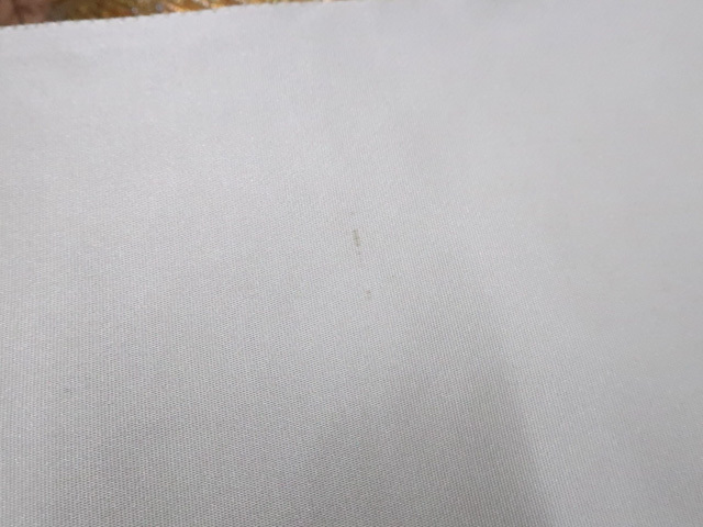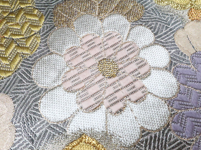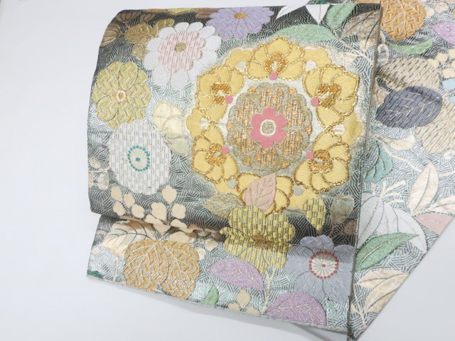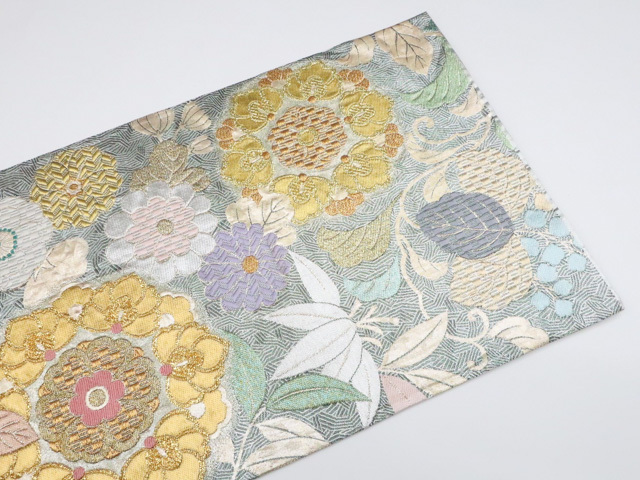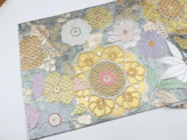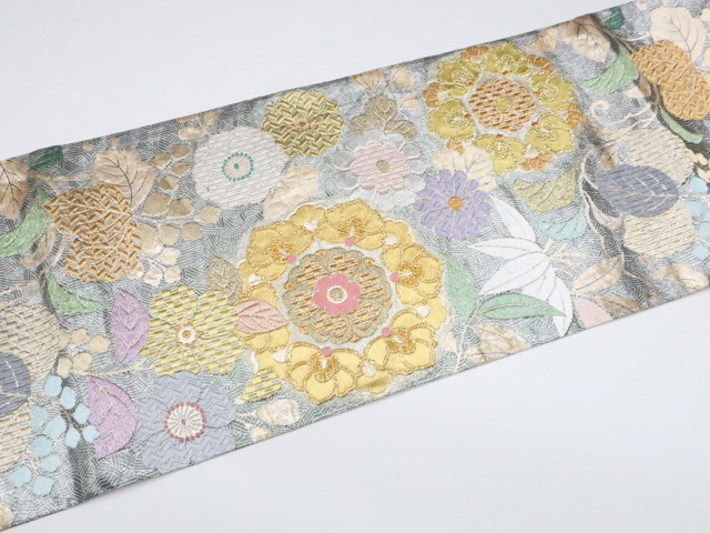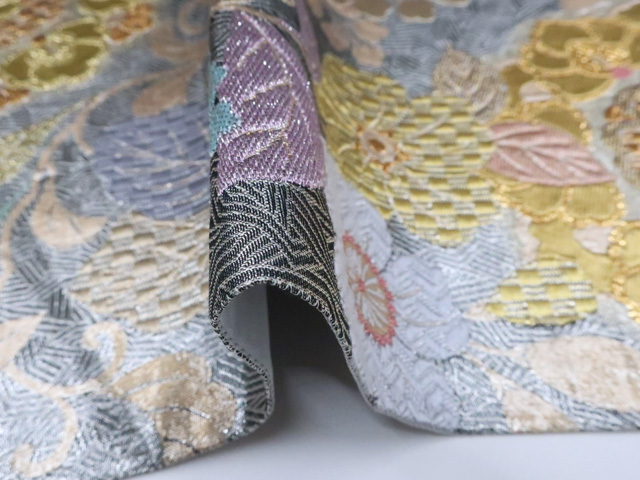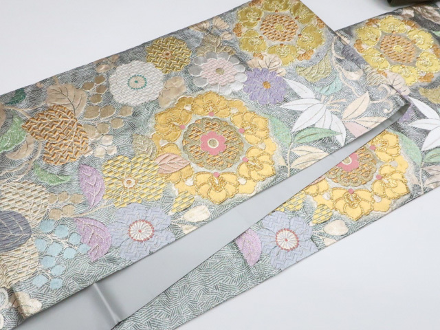 リサイクル商品の為、裏地や折れ山に薄汚れがございますがご着用いただけると存じます。 地色は銀です。 1枚目の画像が近いお色かと思われます。 素材は正絹です。 |