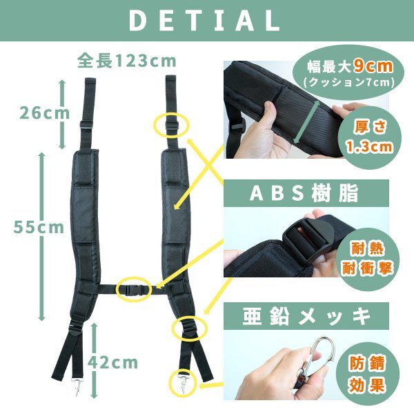 【全長100㎝→123㎝に改良】長さが十分で、大型の背負子から小型の背負式機械まで幅広く取り付け可能。作業者の体格を問わず、十分に緩めてから背負うことができます。小型の機械を背中の下に装着する場合、上部ベルトを長めにセットし、肩クッションがしっかり肩に当たるようにするのがポイントです。