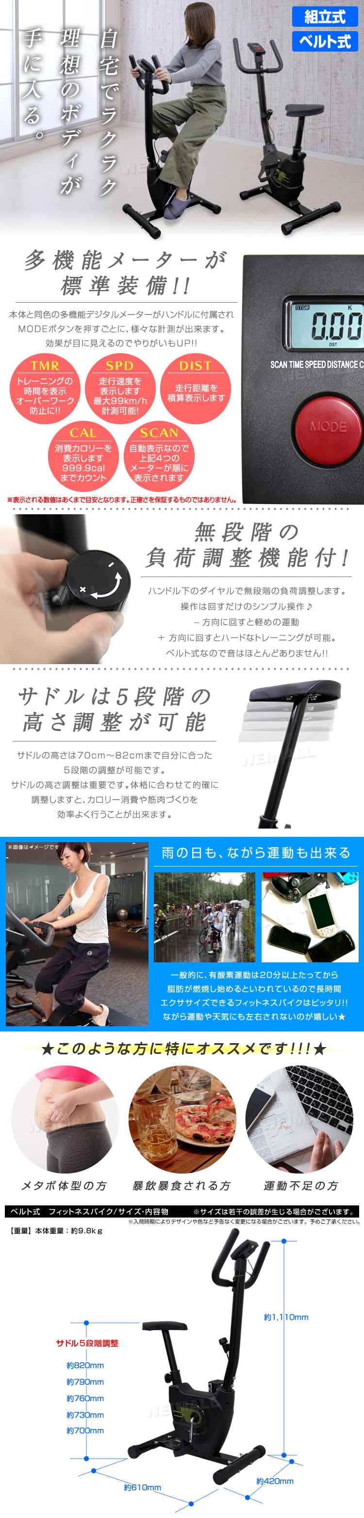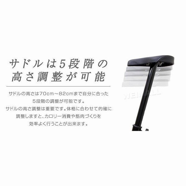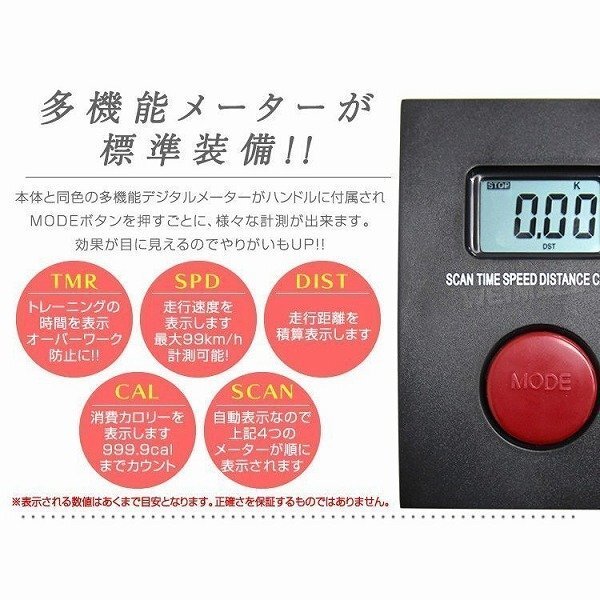 テレビを観ながら、好きな音楽を聞きながら、自分のスタイルに合わせて運動が行えます。 ベルト負荷タイプなので、運動時の音が静かです。 時間を気にせずトレーニング可能! 多機能メーターが付いています。 スピード、時間、距離と更に嬉しい消費カロリーも表示できます♪ これで運動もより効率的に! 【商品仕様】 カラー:ブラック 本体サイズ(約):610mm×420mm×1110mm サドル7段階調整:約700mm~820mm 重量(約):9.8kg 負荷:ベルト負荷方式 メーター表示機能:時間、スピード、走行距離、消費カロリー 耐荷重:100kg 材質:スチール、プラスチック他 使用電池:単三電池×2本(別売) |