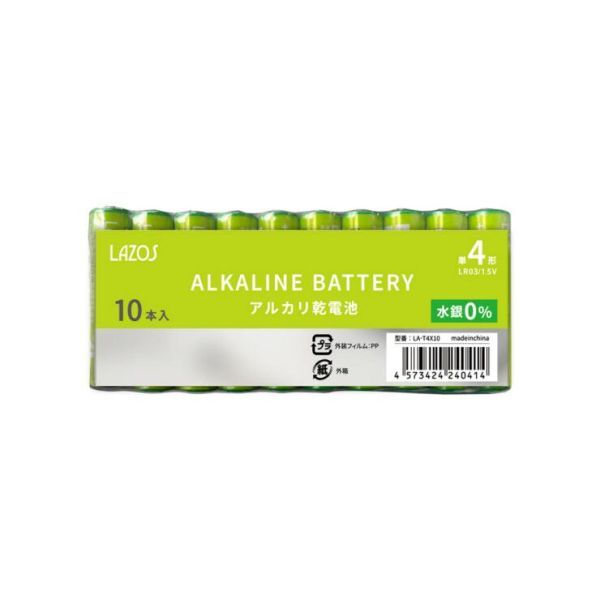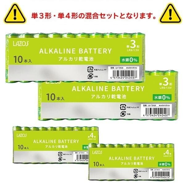 【Lazos単4アルカリ乾電池】LA-T4X10 x2パック・水銀0・1.5V