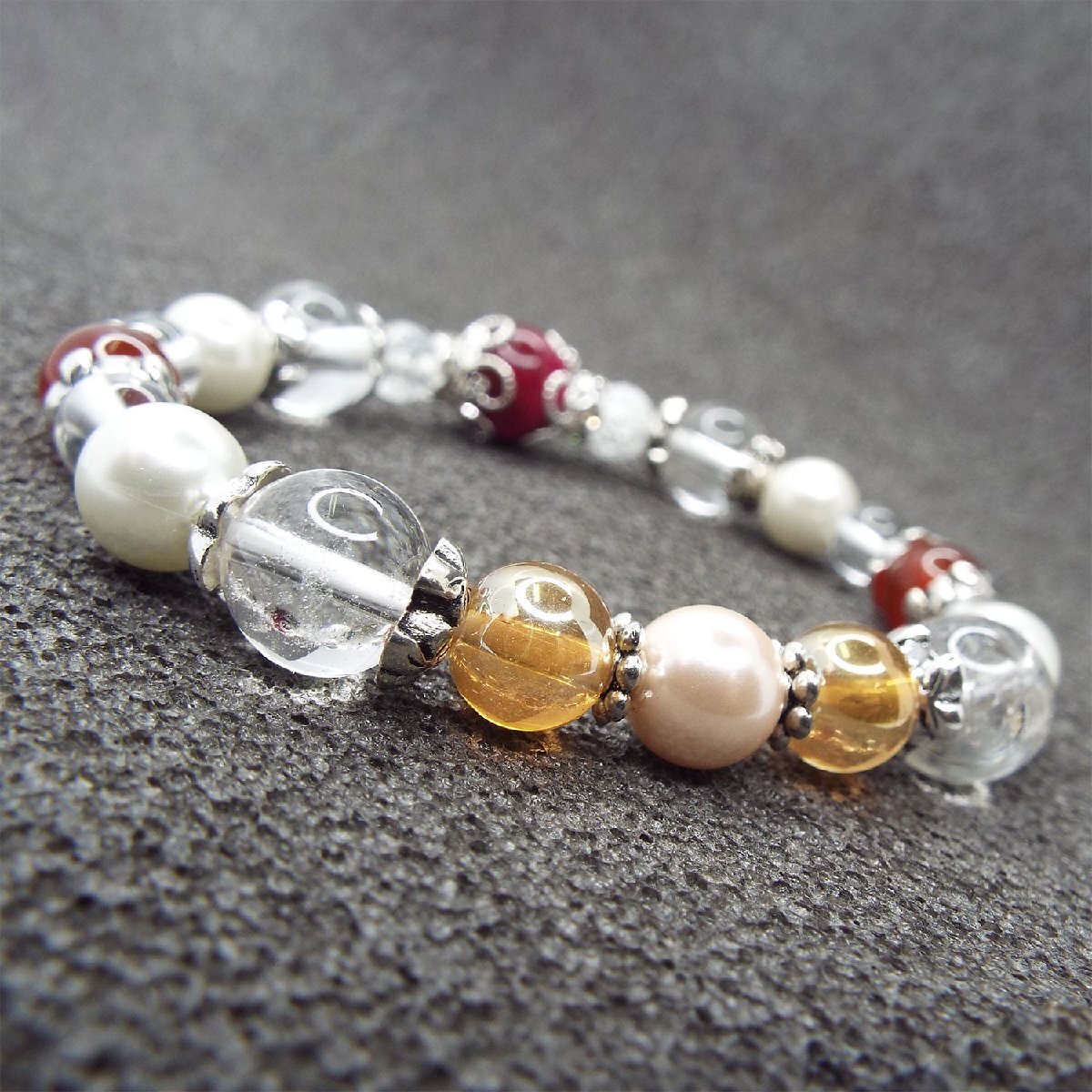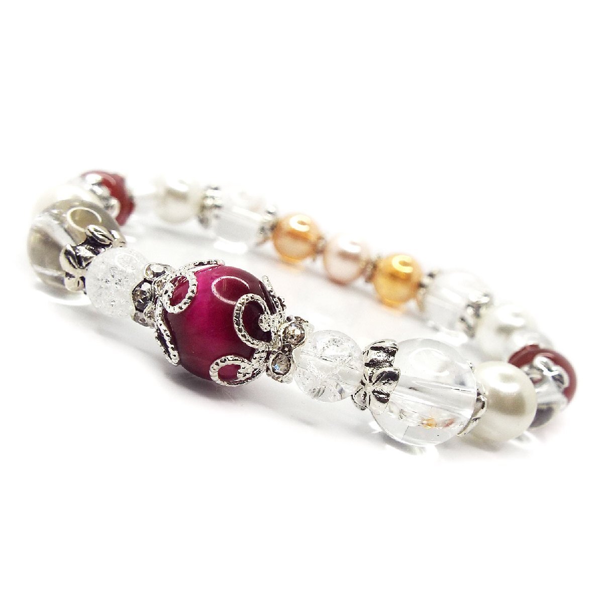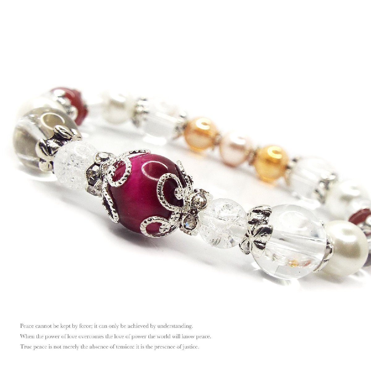| 【STONE KITCHEN 天然石 パワーストーン】 女性らしさUP☆ 女性らしく清潔感たっぷりのブレスレット!! ブレスレット1つで女性らしさを作ってくれるモテブレス♪ 【カーネリアン】引っ込み思案な性格を積極的に変えて 持ち主を元気にさせてくれ夢を実現にしてくれ持ち主に活力を与えてくれる。 【ピンクタイガーアイ】もとから勝ち気な人には向かないと思われますので要注意です。 勝ち気な人がどうしてもタイガーアイを使いたいときはカーネリアンを入れて中和することができます。 内周:約16cm サイズ:ピンクタイガーアイ 10mm シェルパール 8mm 水晶 10mm・6mm カーネリアン 8mm ゴールデンオーラ水晶 8mm 1点 注意事項 ※金属部分は汗や汚れ等で変色する場合がございます。気になる場合は 金属磨きや布等で軽くふき取る事をおすすめします。 ※石の種類によっては、艶を引き出すことを目的として、ワックスや着色加工がされているものもあります。 ※表示のサイズは必ずしも最大値・最小値のサイズのものが入っているわけではございません。 ※天然石のため同じものでも色味・模様などが異なります。 ※照明の具合で実際とは色合いが異なる場合がございます。 また、天然素材特有のクラック・内包物を有する場合がございます。予めご了承下さい。 | |