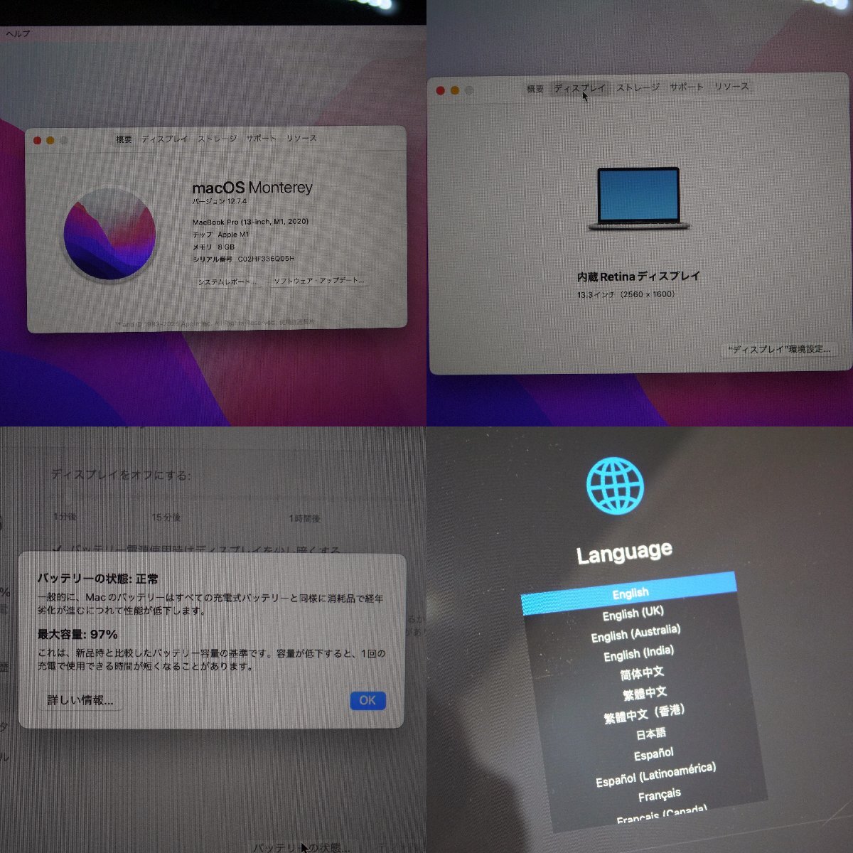 | 商品名 | 【 MacBook Pro 13インチ 】 型番 : 【 MYDC2J/A(A2338) 】 ※商品の詳細は、写真及びメーカーHPをご確認下さい。 ※バッテリー最大容量は「97%」と表示されています。 |