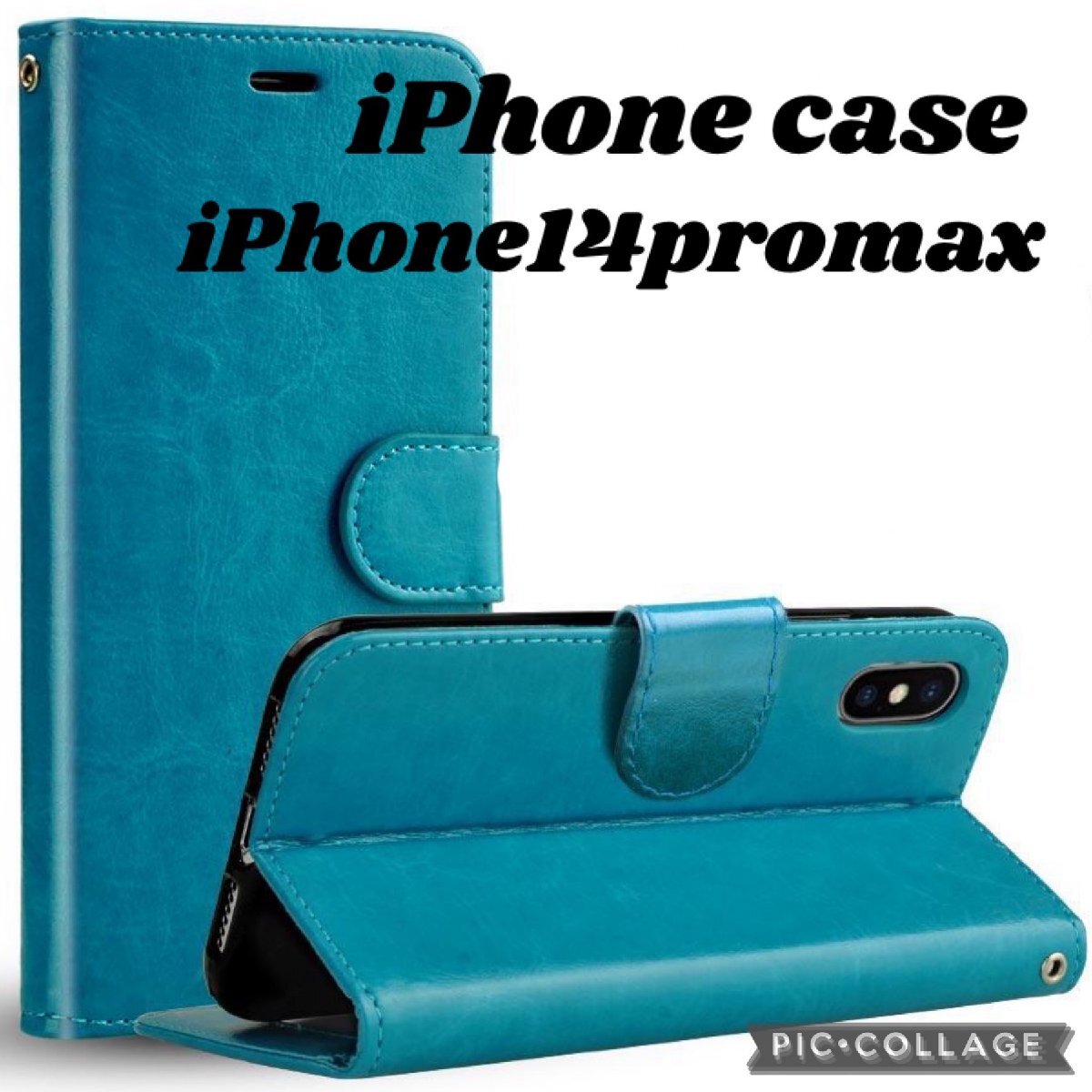 【iPhone14ProMax:ターコイズブルー】iPhone ケース 手帳型 液晶強化ガラスフィルム 2点 セット 保護フィルム カード スマホケース A58