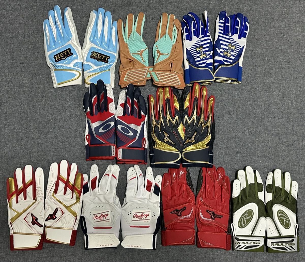MIZUNO PRO シリコンパワーアークDI・NIKE JORDANフライエリート・Rawlings WORK HORSE・Rawlings ハイパーグリップ・ZEET プロステイタス プロ限定モデル・OAKLEY STRIKING GLOVE・UAクリーンアップ プロ ・MIZUNO ウィルドライブ レッド・MIZUNO ウィルドライブ レッド限定リミテッドモデルバッティンググローブ9セット 総額58,410円(税込)