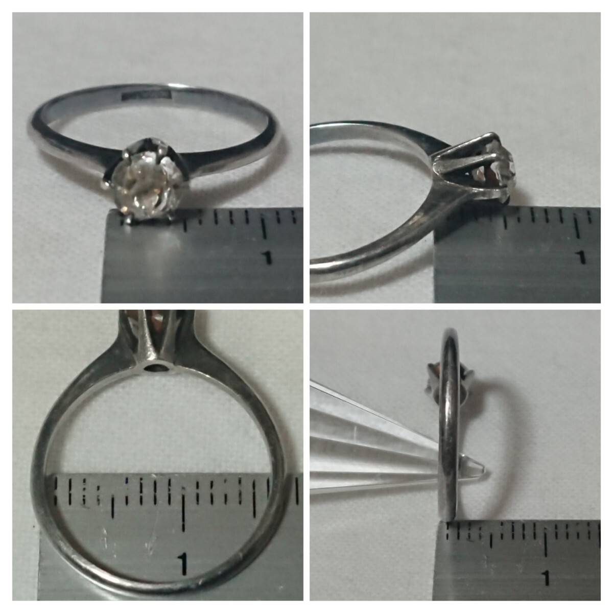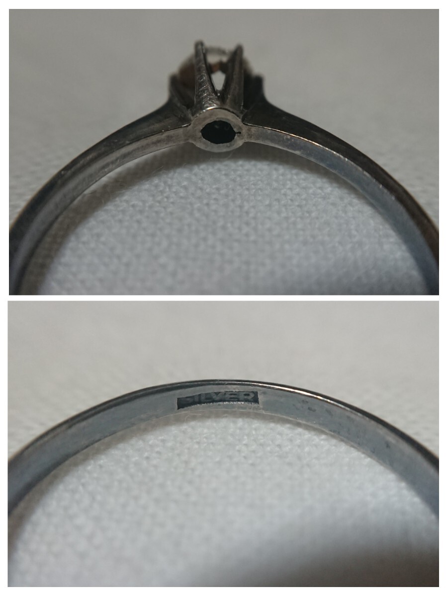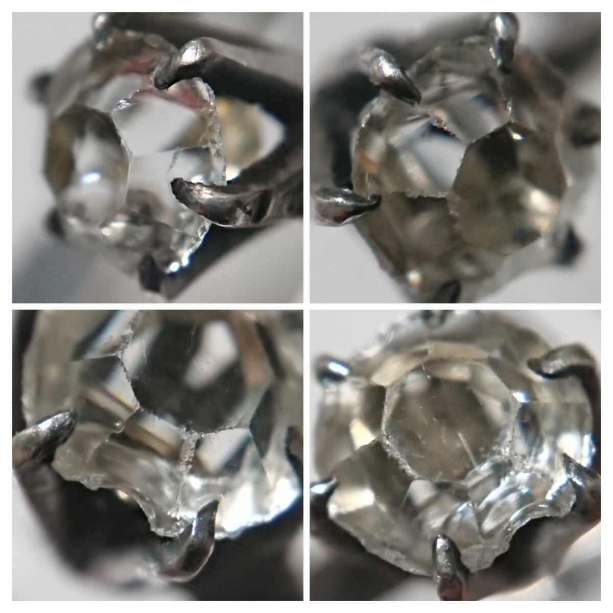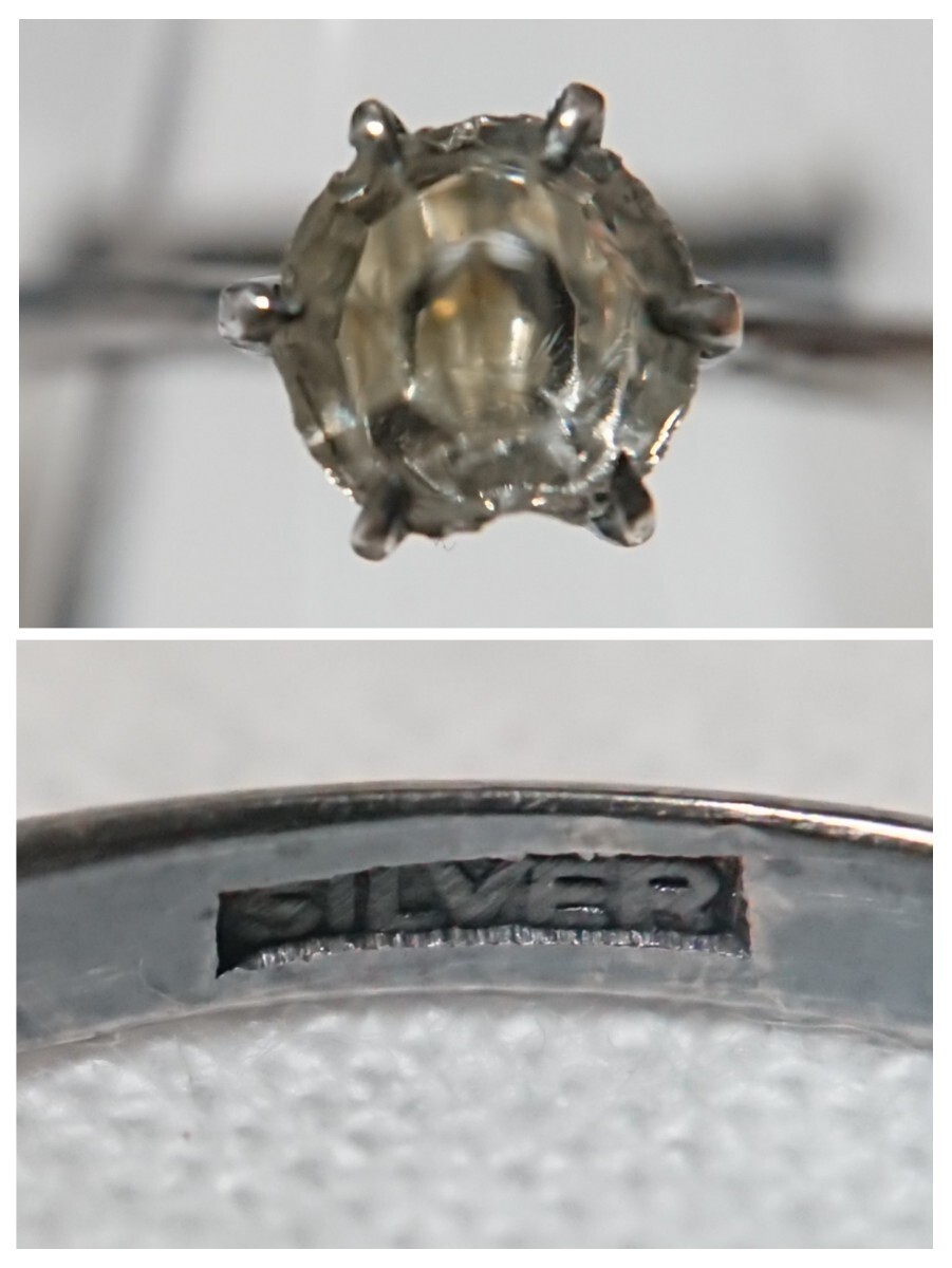 ヴィンテージシルバーリングで内側には【SILVER】の刻印がみられ、立爪部分にセットされているのはクリアな天然石か人工石またはガラス系で小さな欠け部分など小傷ございます。クリア部分の底まわりにはフォイルバック塗装されていますがところどころ塗装が剥げてます(画像7枚目)。装着には問題ございません。