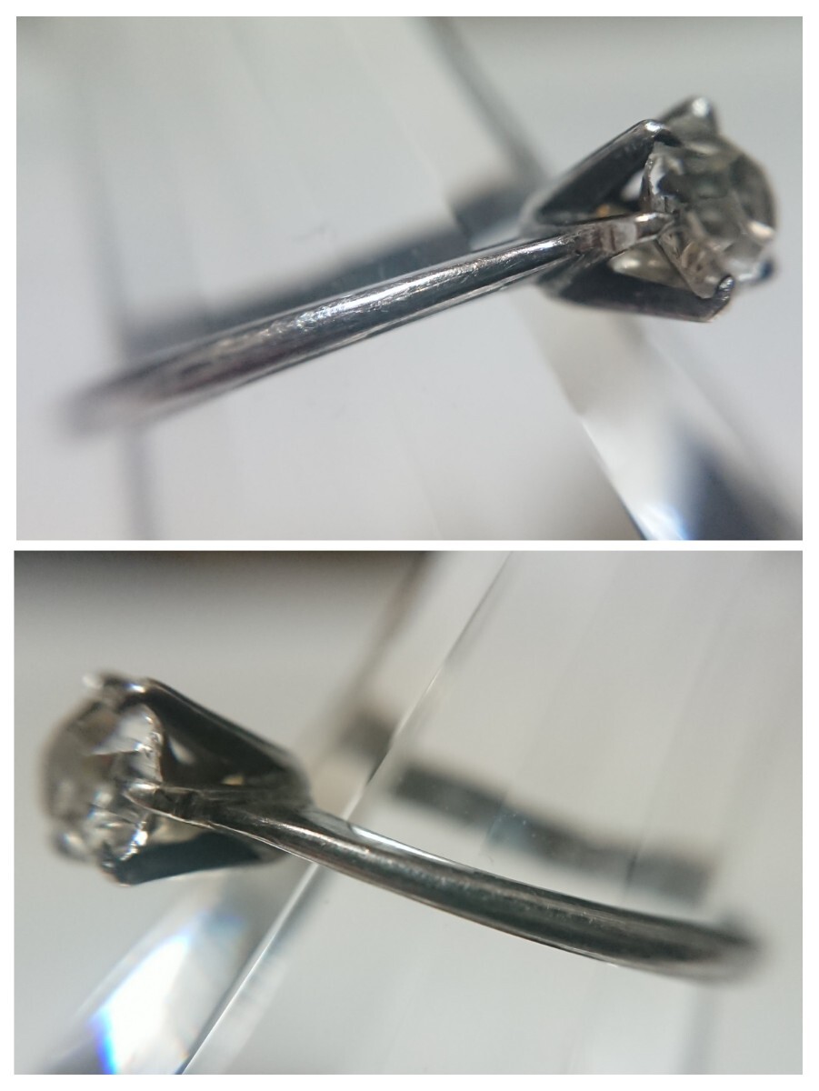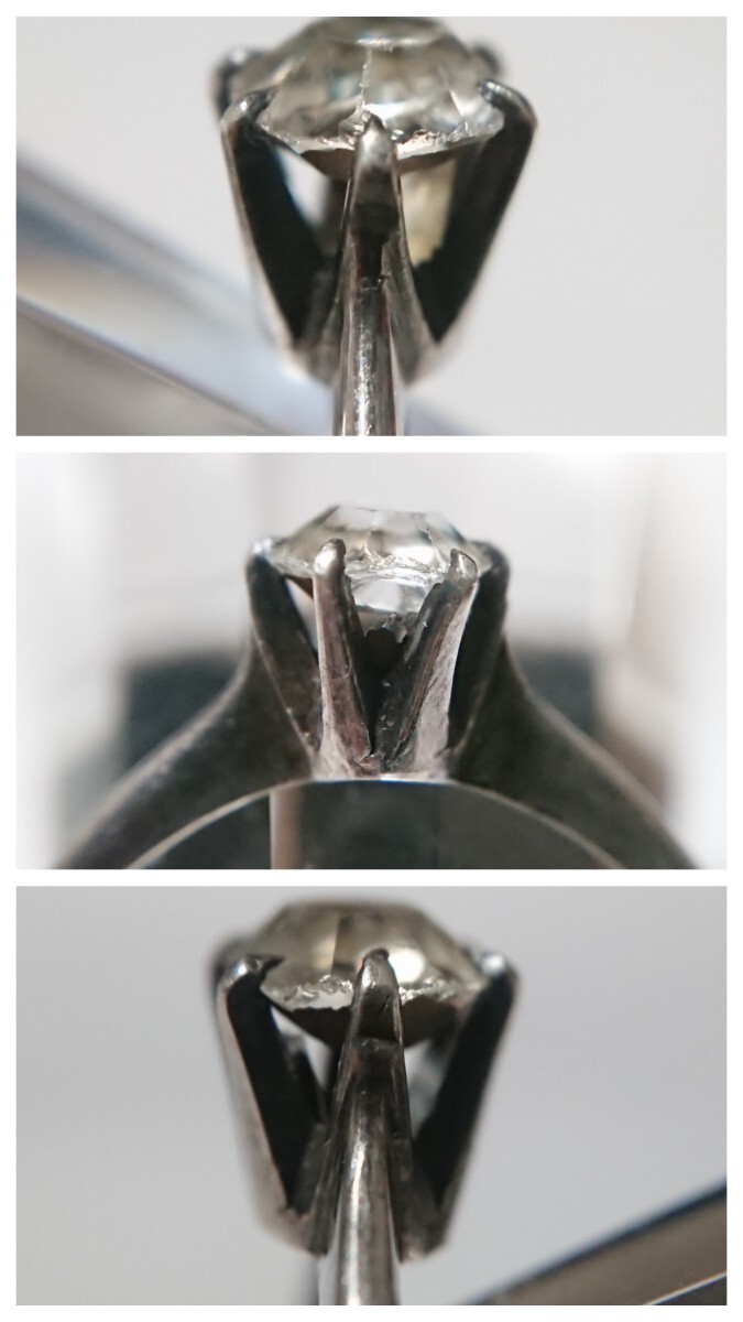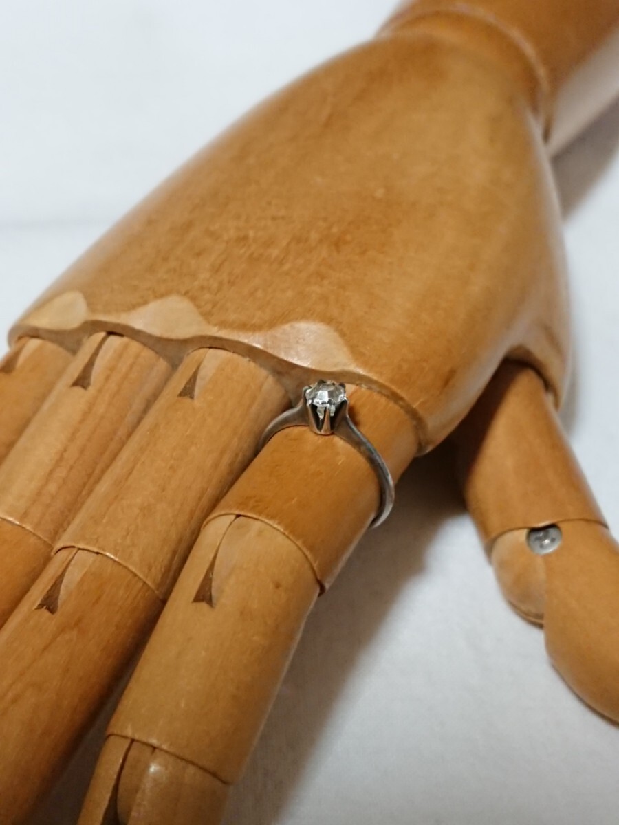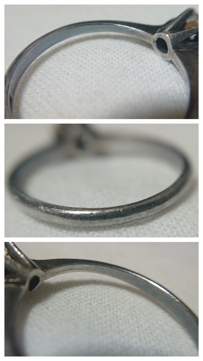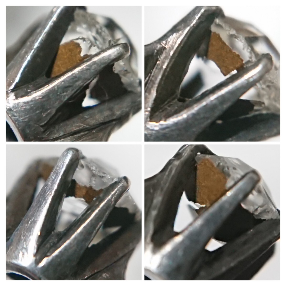 ヴィンテージシルバーリングで内側には【SILVER】の刻印がみられ、立爪部分にセットされているのはクリアな天然石か人工石またはガラス系で小さな欠け部分など小傷ございます。クリア部分の底まわりにはフォイルバック塗装されていますがところどころ塗装が剥げてます(画像7枚目)。装着には問題ございません。